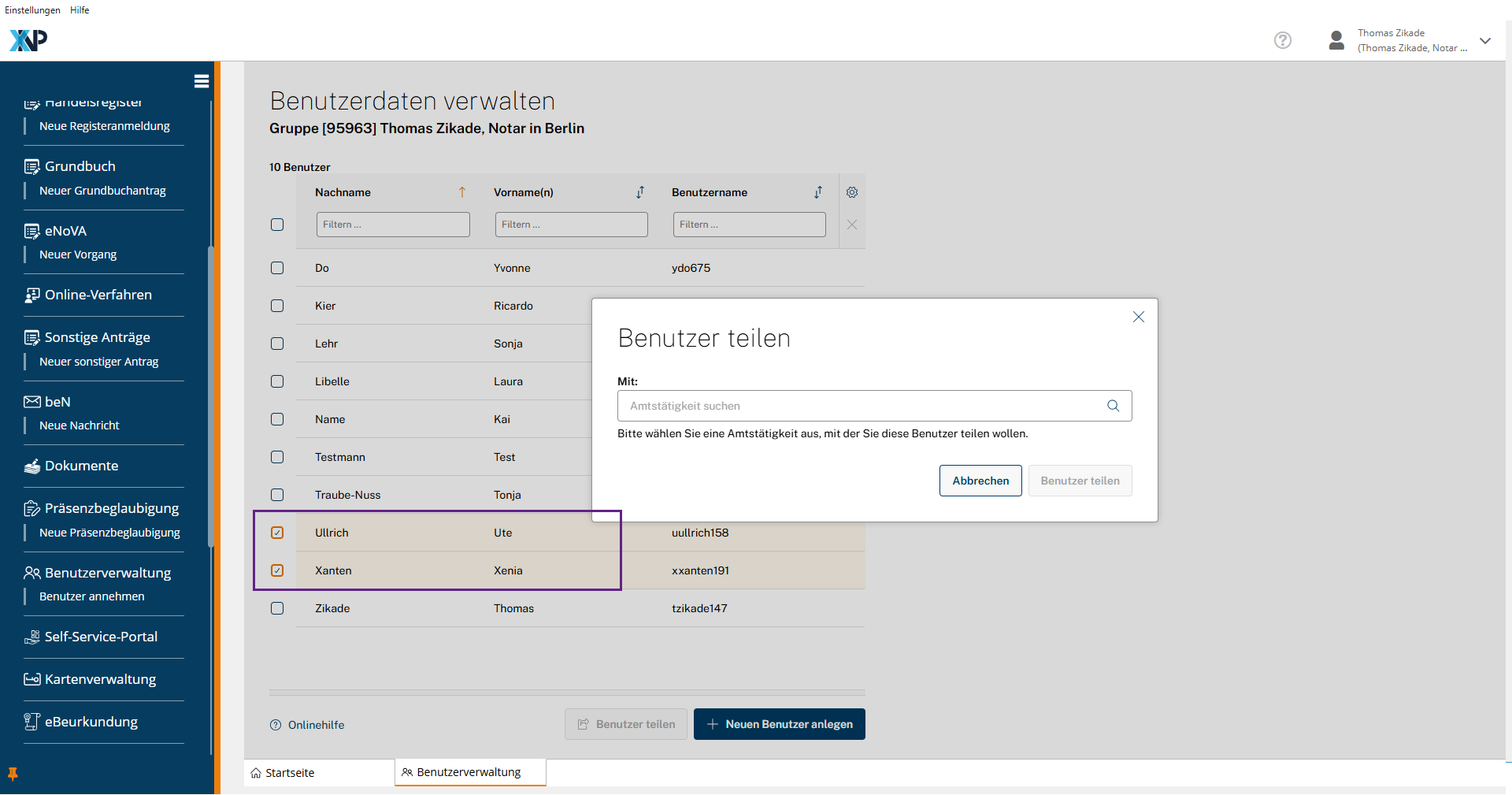 Öffnen Sie als teilende Notarin oder teilender Notar die Gesamtübersicht in der Benutzerverwaltung. Wählen Sie durch Setzen eines Häkchens in der jeweiligen Checkbox die Benutzer aus, die Sie mit einer weiteren Amtstätigkeit teilen möchten. Betätigen Sie anschließend die Schaltfläche Benutzer teilen.