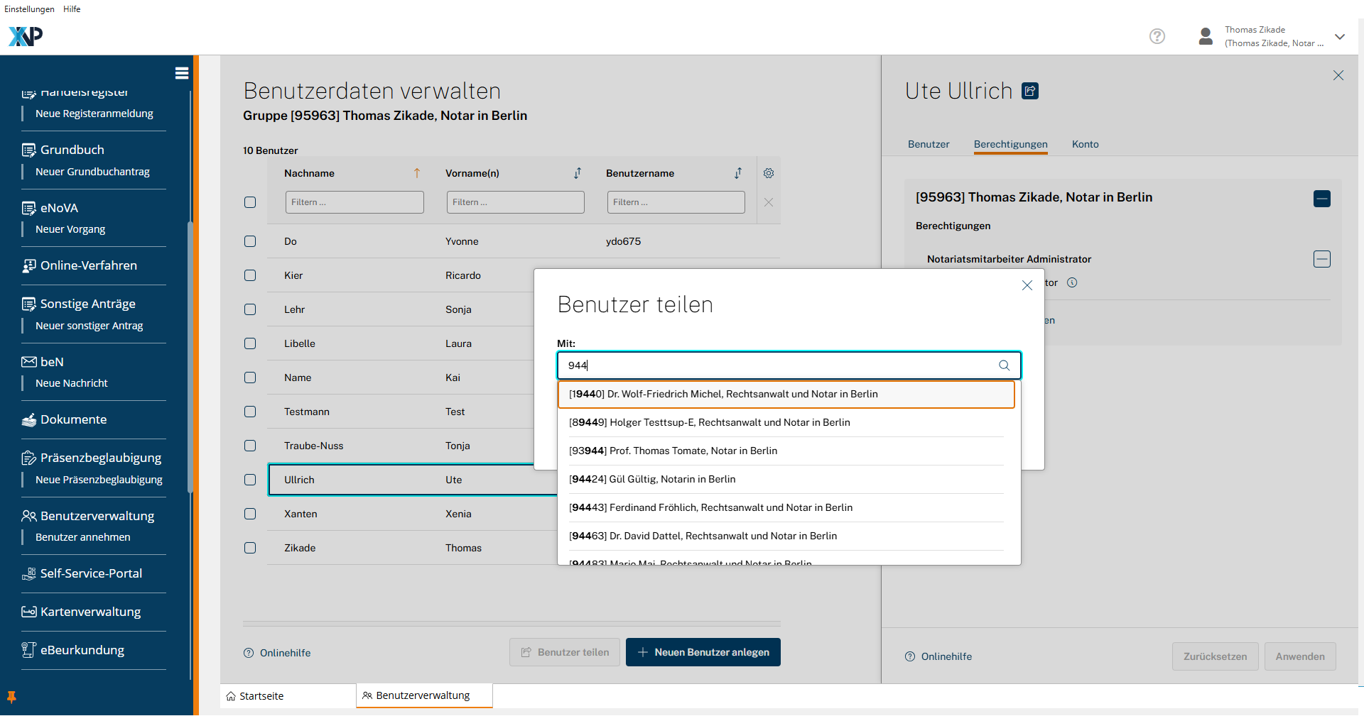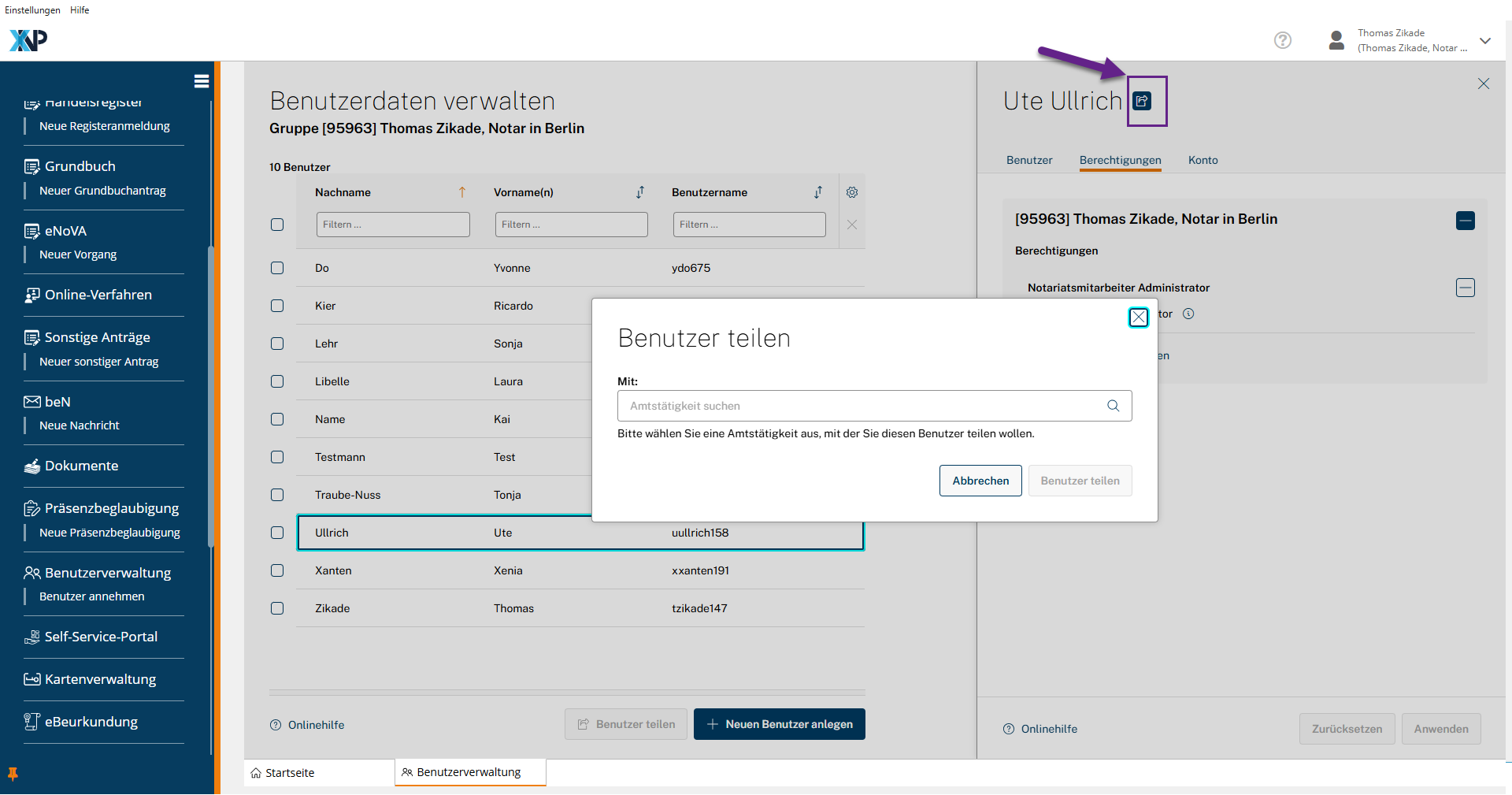 Notarinnen und Notare können Benutzer einzelner Mitarbeitenden mit anderen Amtstätigkeiten (Notarinnen und Notaren) teilen.