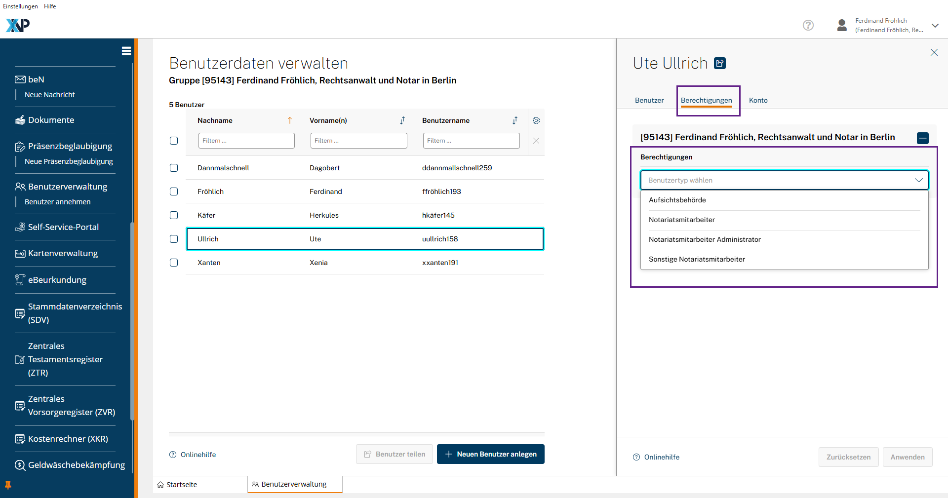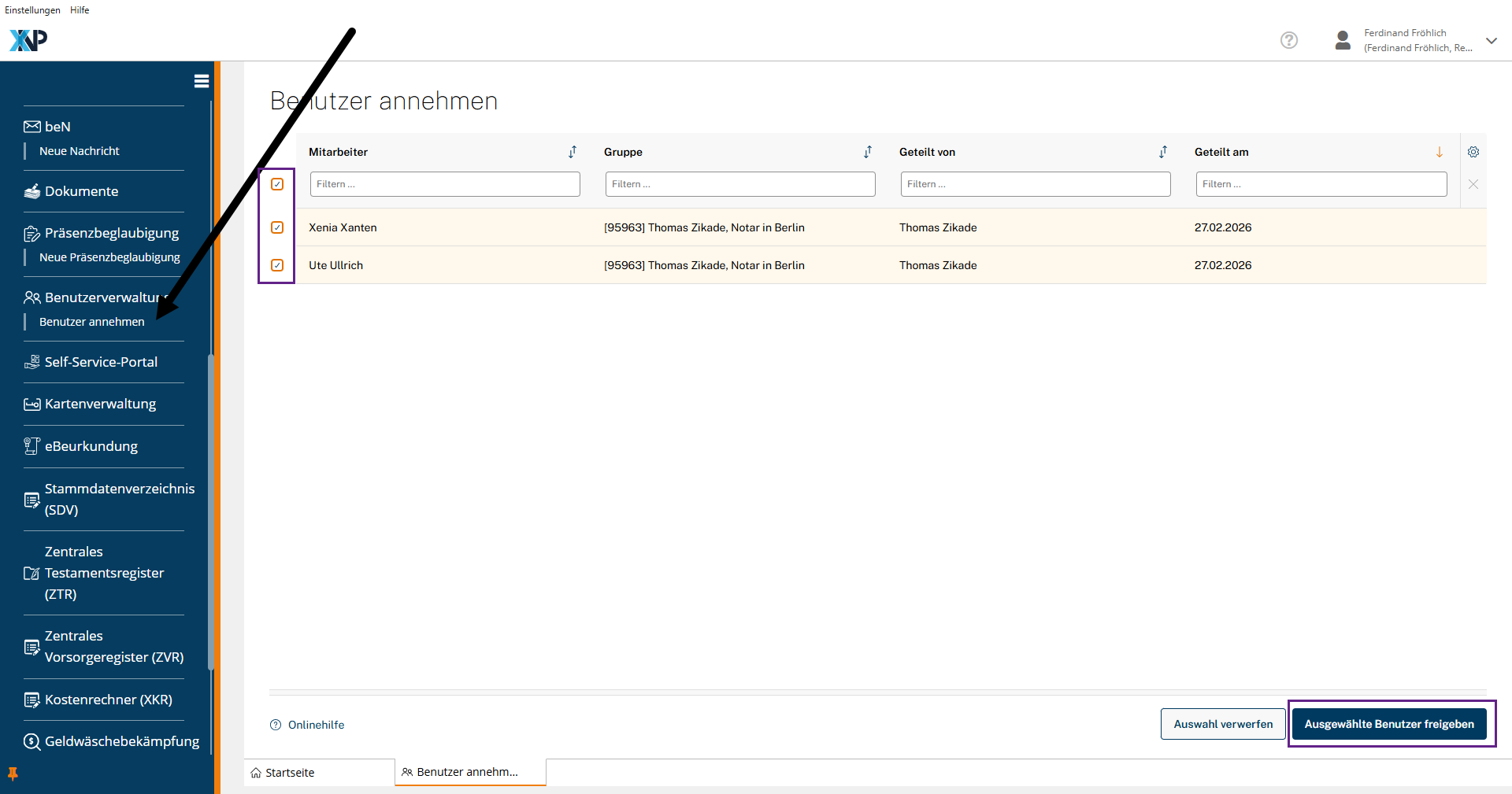 Als annehmende Notarin bzw. annehmender Notar melden Sie sich im Kontext Ihrer Amtstätigkeit in XNP an. Öffnen Sie über die Navigationsleiste die Übersicht Benutzer annehmen. Diese zeigt alle Benutzer an, die aktuell mit Ihrer Amtstätigkeit geteilt wurden. Wählen Sie einen oder mehrere Benutzer durch das Setzen von Häkchen in den Checkboxen aus und klicken anschließend auf Bestätigen. Die geteilten Benutzer werden nun in die Organisationsgruppe Ihrer Amtstätigkeit aufgenommen. Im Anschluss ist für jeden geteilten Benutzer die Berechtigung zu vergeben, die der Benutzer in Ihrer Organisationsgruppe erhalten soll.