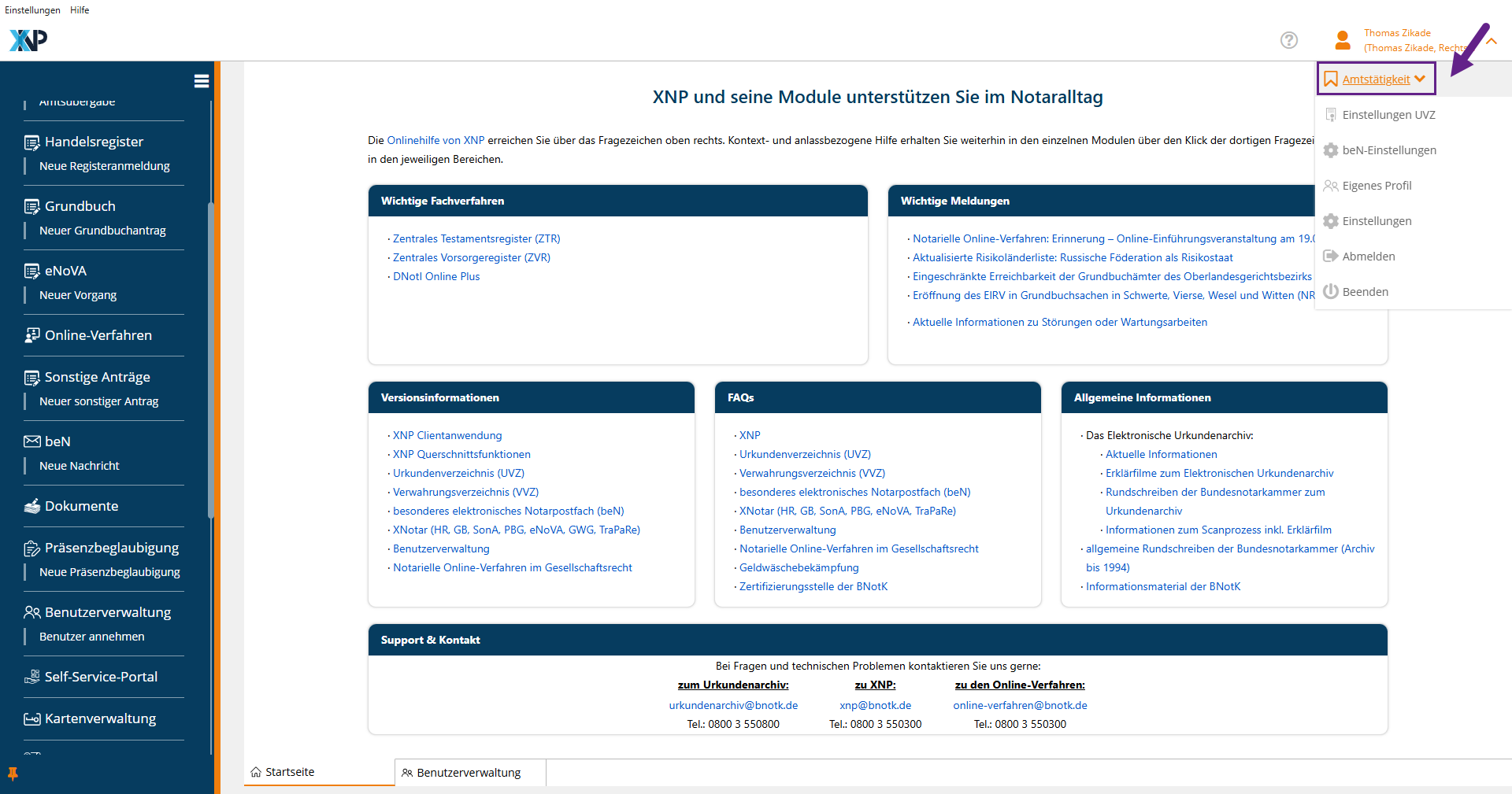 Wenn Ihr Benutzer mehreren Organisationsgruppen (zum Beispiel Amtstätigkeiten) zugeordnet sind, können Sie diese in der ausklappbaren Auswahlliste unter Amtstätigkeiten wechseln. Sie werden über den Wechsel in der ausgewählten Orgnaisationsgruppe angemeldet und agieren dann im Kontext dieser Organisationsgruppe.
