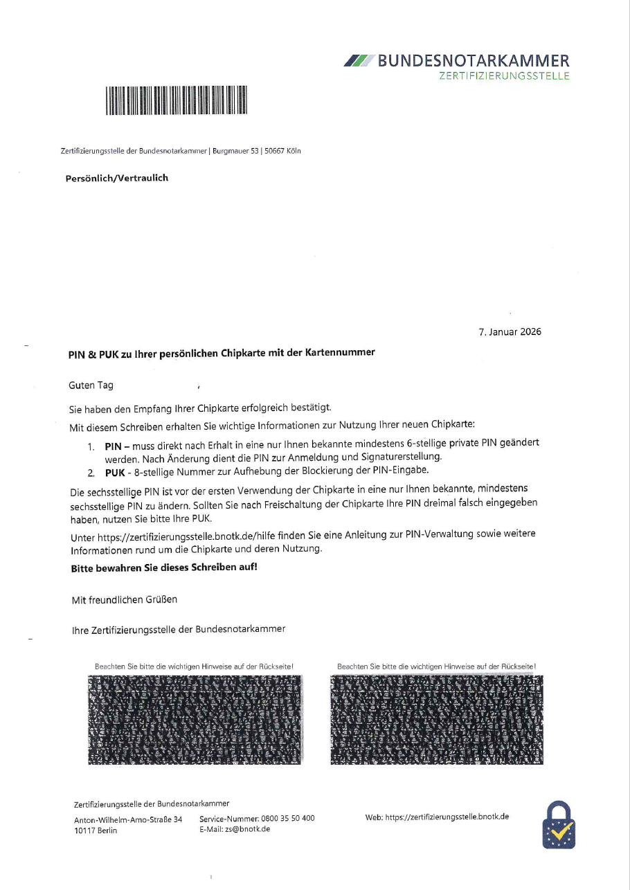 Beim Zugang zur und innerhalb der Basisanwendung der Bundesnotarkammer XNP stößt der Notar bei der Anwendung der enthaltenen Module und Funktionen mit seiner Signaturkarte auf verschiedene PIN-Abfragen. Nach Aktivierung des besonderen elektronischen Notarpostfachs (beN) und mit Erhalt der Karte und dem dazugehörigen PIN-Brief von der Zertifizierungsstelle der Bundesnotarkammer liegt dem Notar alles Notwendige zur Authentifizierung des Zertifikatsinhabers bei der Erstellung und Anbringung von qualifizierten Signaturen vor.