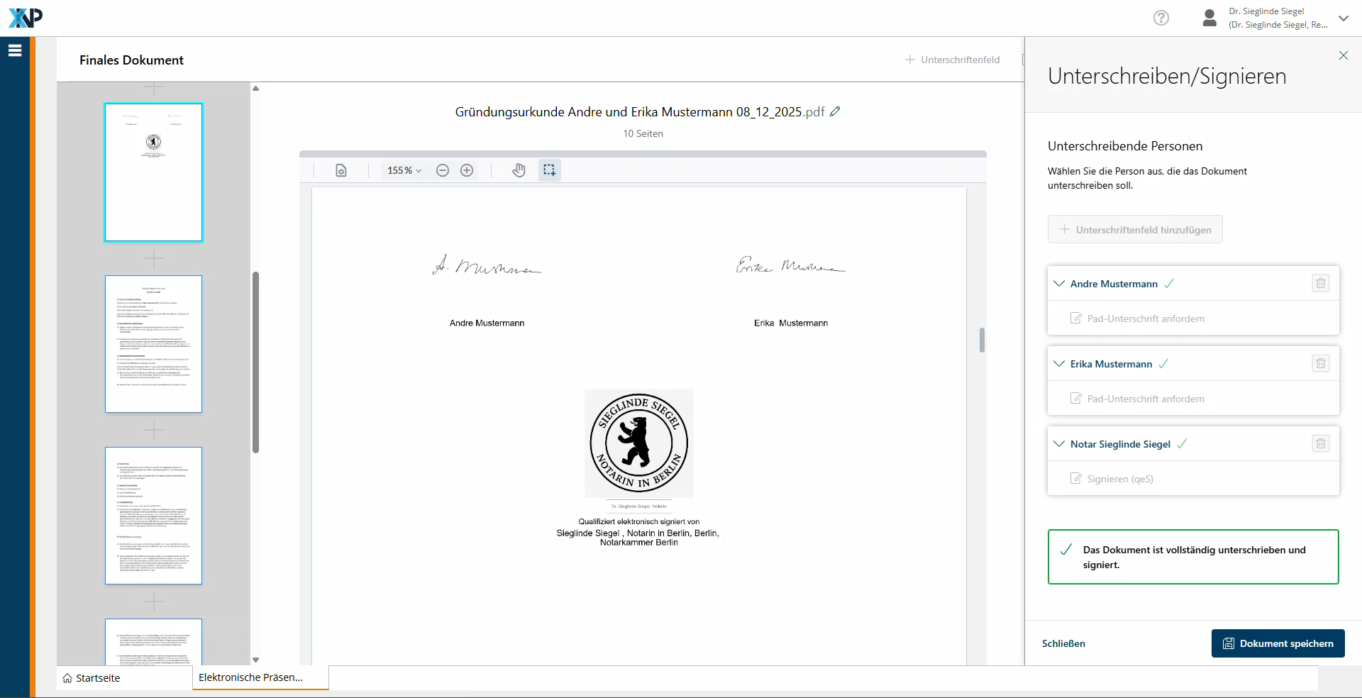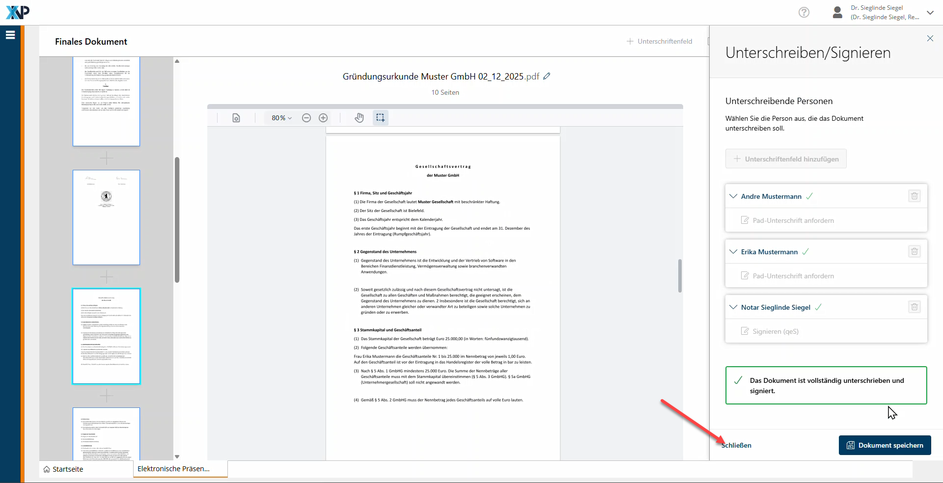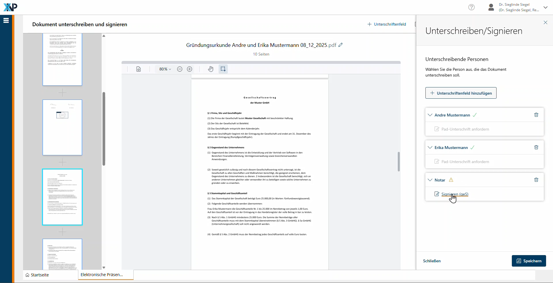Sofern die Beteiligten dies wünschen, kann die Notarin oder der Notar es Ihnen ermöglichen, das Anbringen der Unterschriften im Dokument mitzuverfolgen, indem zu diesem Zeitpunkt erneut der Bildschirm geteilt wird. Die Notarin oder der Notar stellt dafür wieder die Verbindung zum zweiten Bildschirm her und beendet das Teilen des Bildschirms nach der Unterzeichnung durch den letzten Beteiligten.