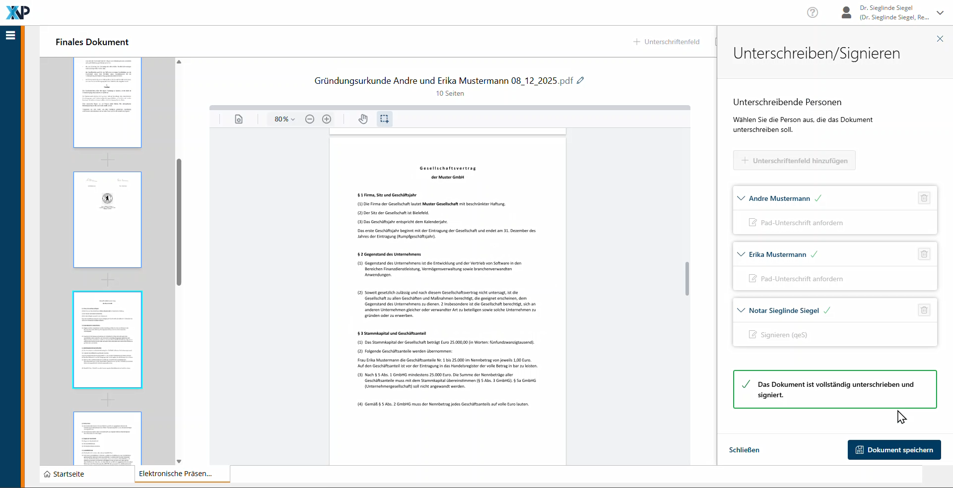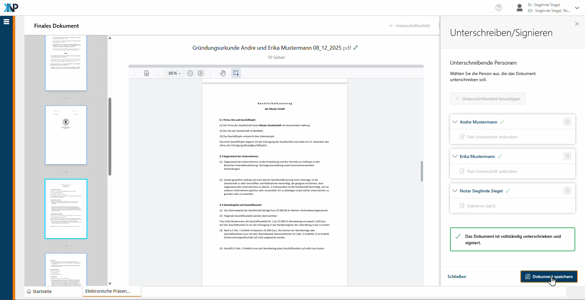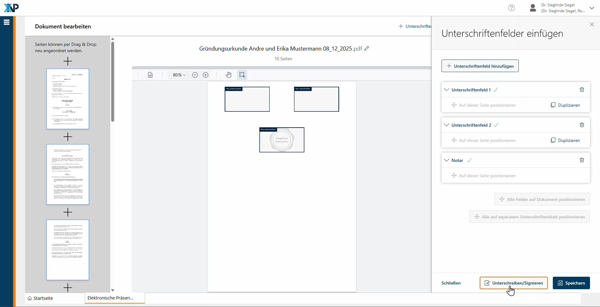 Sofern die Beteiligten dies wünschen, kann die Notarin oder der Notar es Ihnen ermöglichen, das Anbringen der Unterschriften im Dokument mitzuverfolgen, indem zu diesem Zeitpunkt erneut der Bildschirm geteilt wird. Die Notarin oder der Notar stellt dafür wieder die Verbindung zum zweiten Bildschirm her und beendet das Teilen des Bildschirms nach der Unterzeichnung durch den letzten Beteiligten.