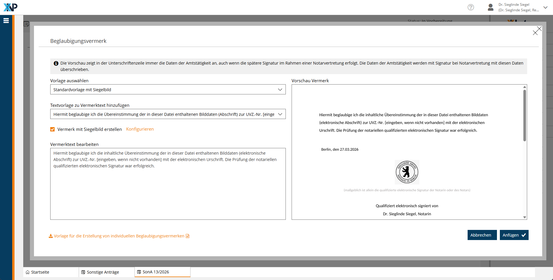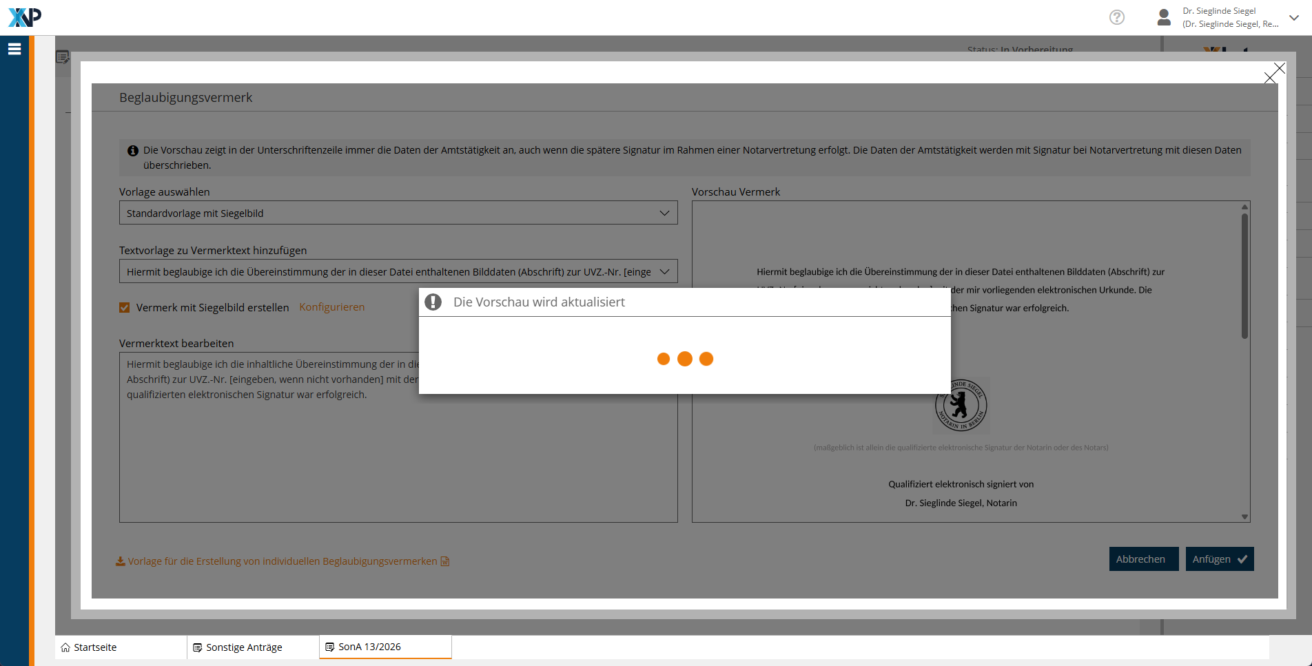 Mitarbeitende können elektronisch beglaubigte Abschriften im XNP-Modul Sonstige Anträge so weit vorbereiten, dass die Notarin oder der Notar nur noch die Signatur aufbringen muss.