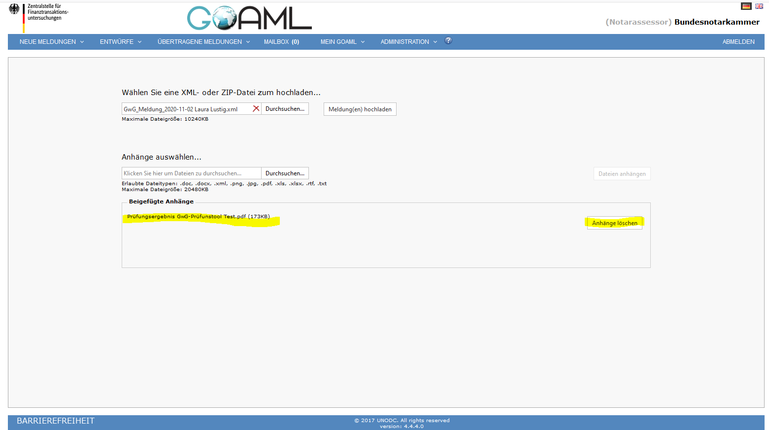 goAML bietet keine Schnittstelle für die direkte Übermittlung der XML-Datei aus dem GwG-Meldeportal der Bundesnotarkammer. Aus diesem Grund muss nach Eingabe der Daten die Meldung als XML-Datei heruntergeladen und anschließend bei goAML hochgeladen werden.
