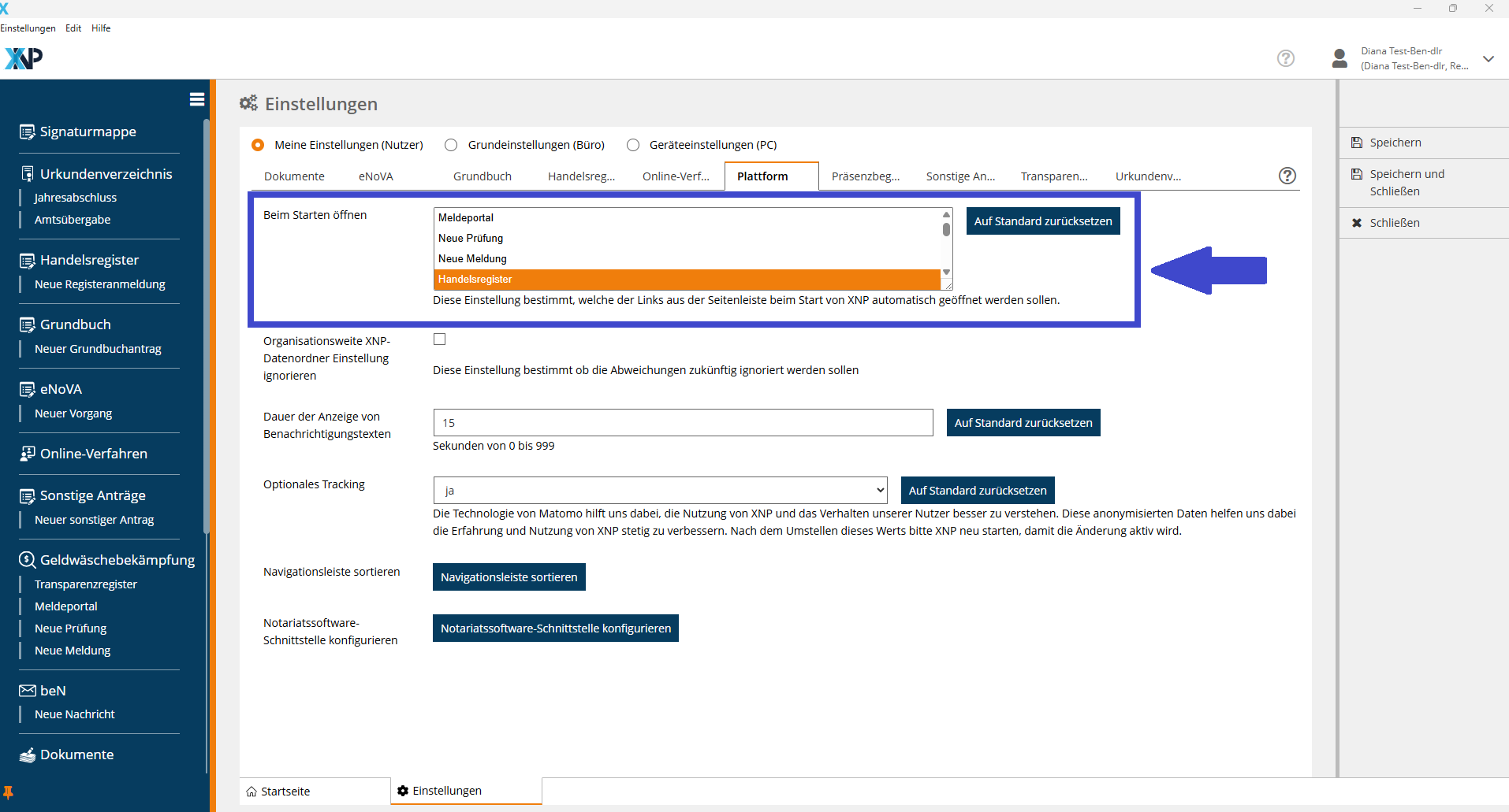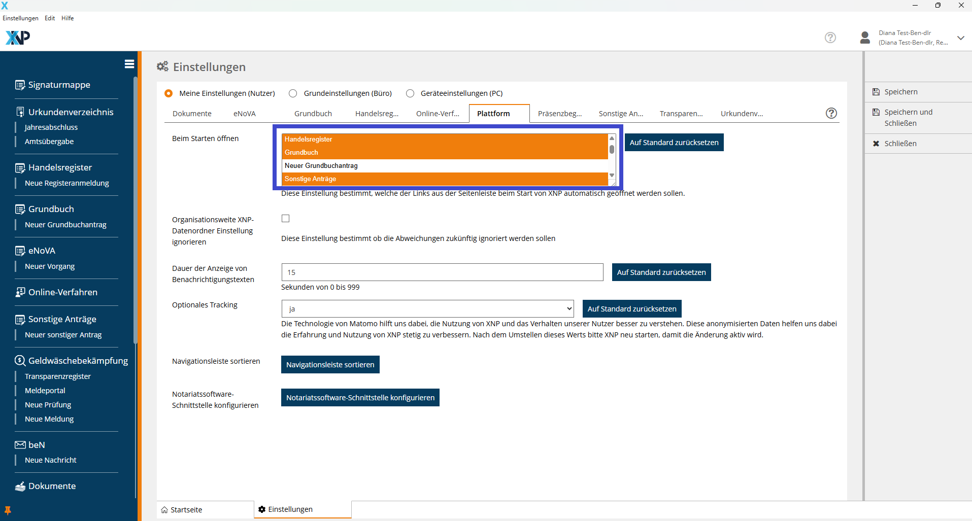 Mit der Nutzereinstellung “Beim Start öffnen” ist es möglich zu bestimmen, welche Reiter bereits beim Start von XNP anwendungsseitig geöffnet werden sollen.