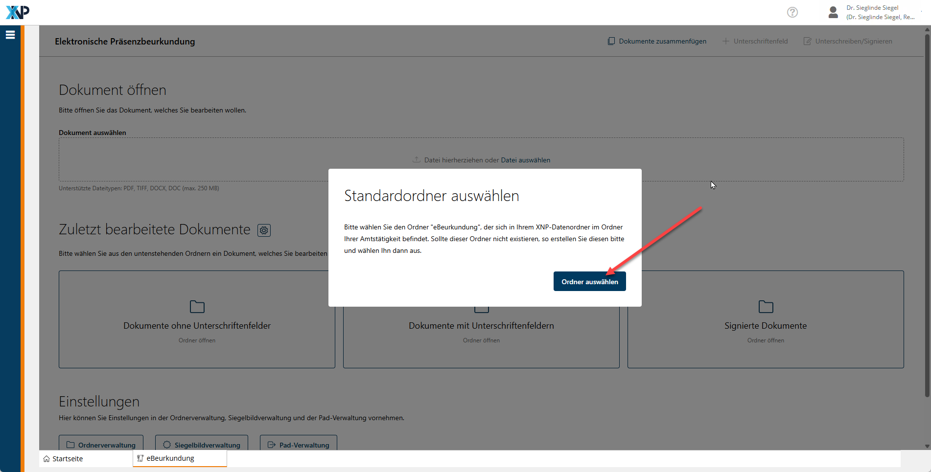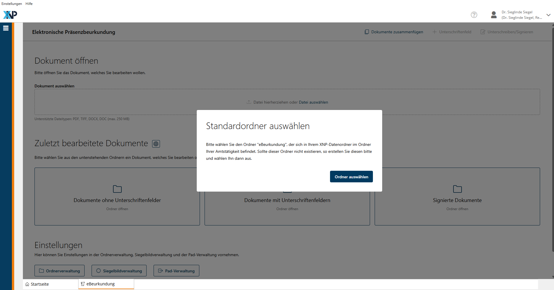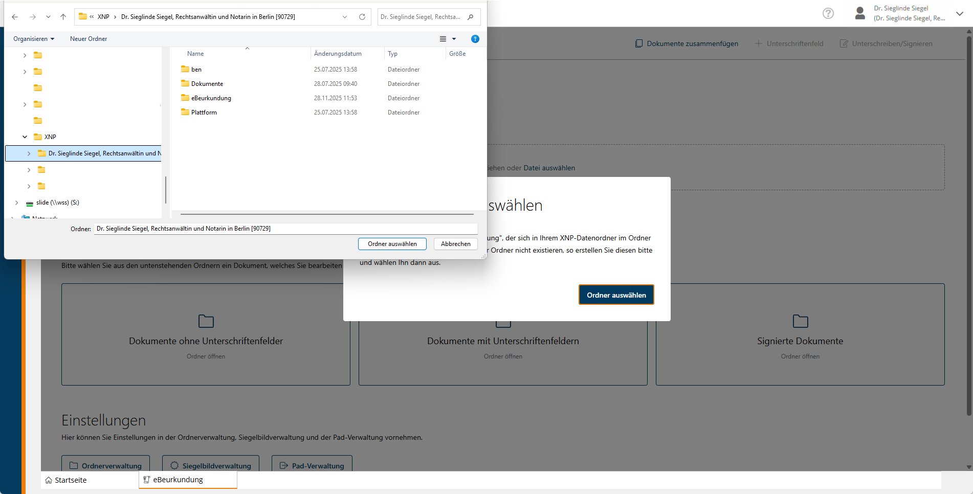 Vor der ersten Nutzung muss im XNP-Modul eBeurkundung ein Standardordner festgelegt werden. In diesem werden automatisch drei Unterordner erstellt, in denen das Modul standardmäßig Dokumente ablegt sowie ein Ordner für die Siegelbildverwaltung. Empfohlen wird die folgende Verortung des Ordners: