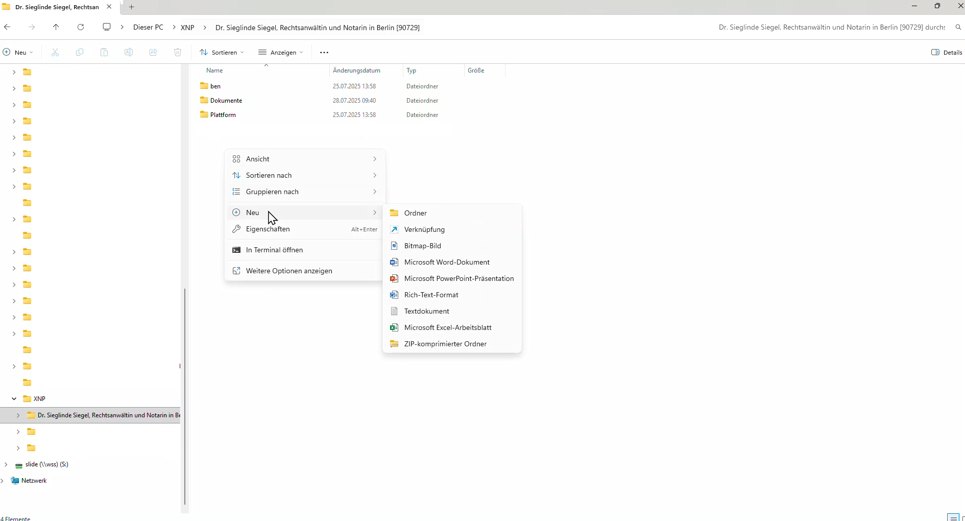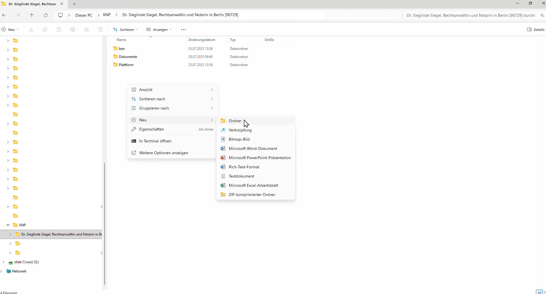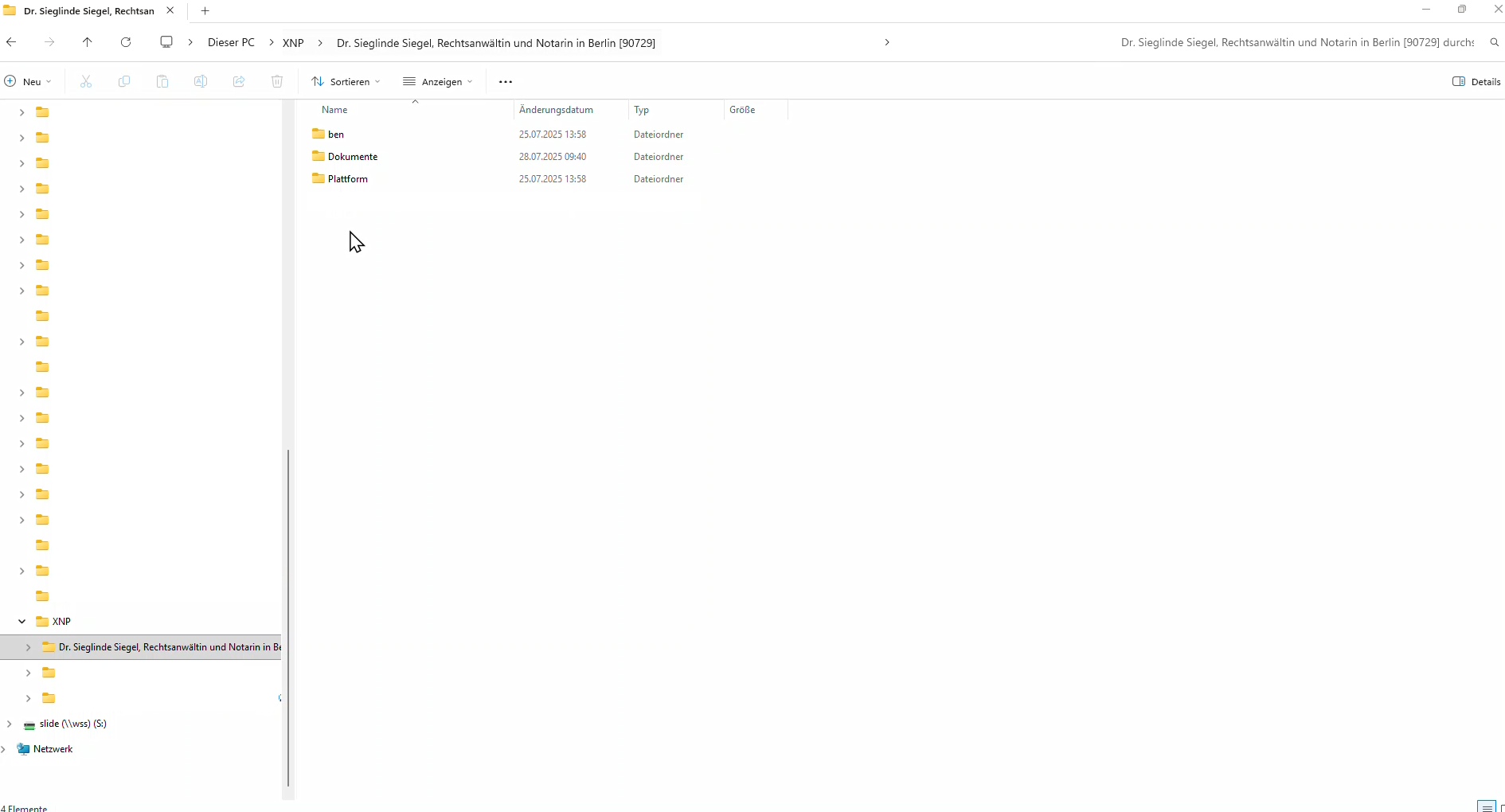 Vor der ersten Nutzung muss im XNP-Modul eBeurkundung ein Standardordner festgelegt werden. In diesem werden automatisch drei Unterordner erstellt, in denen das Modul standardmäßig Dokumente ablegt sowie ein Ordner für die Siegelbildverwaltung. Empfohlen wird die folgende Verortung des Ordners: