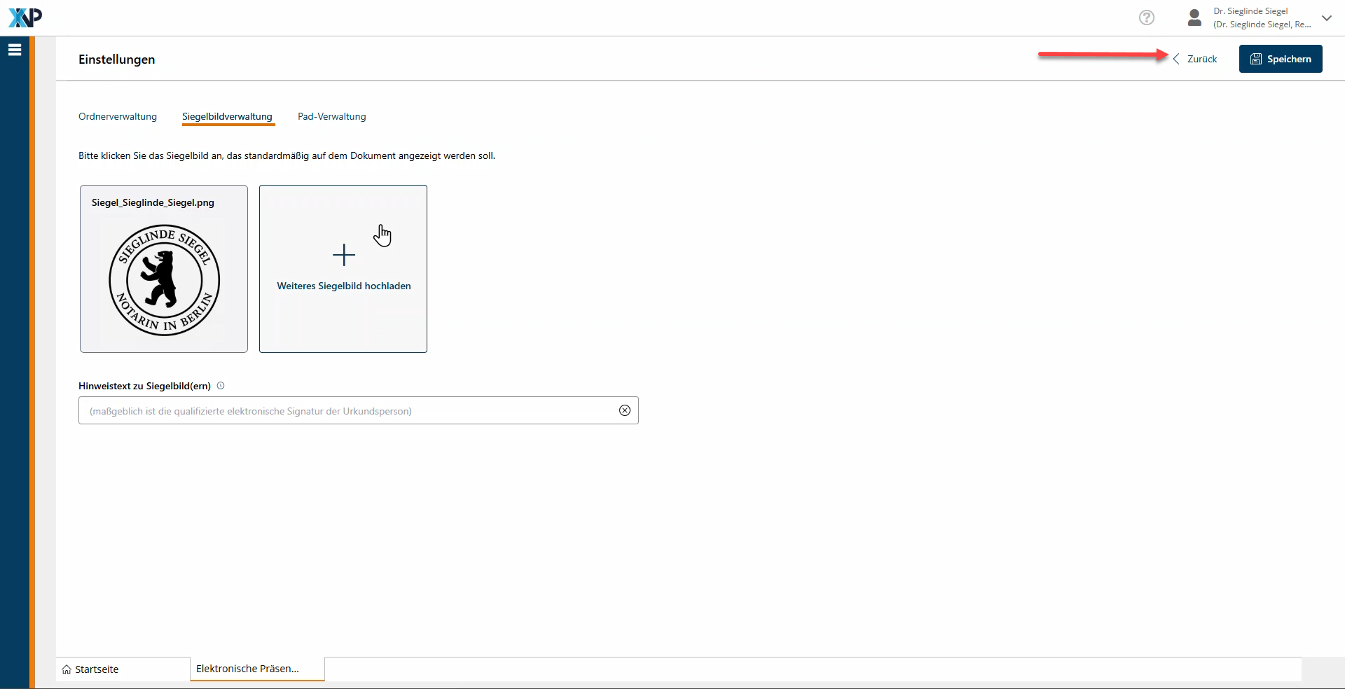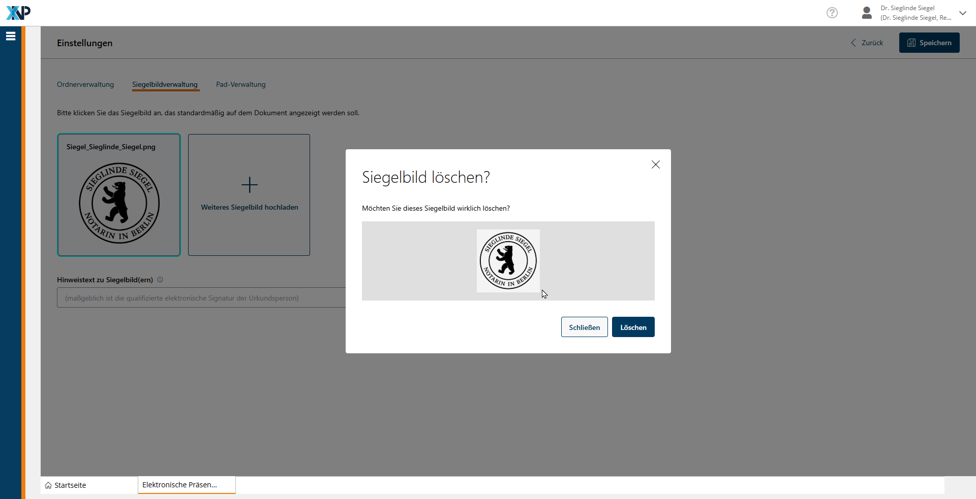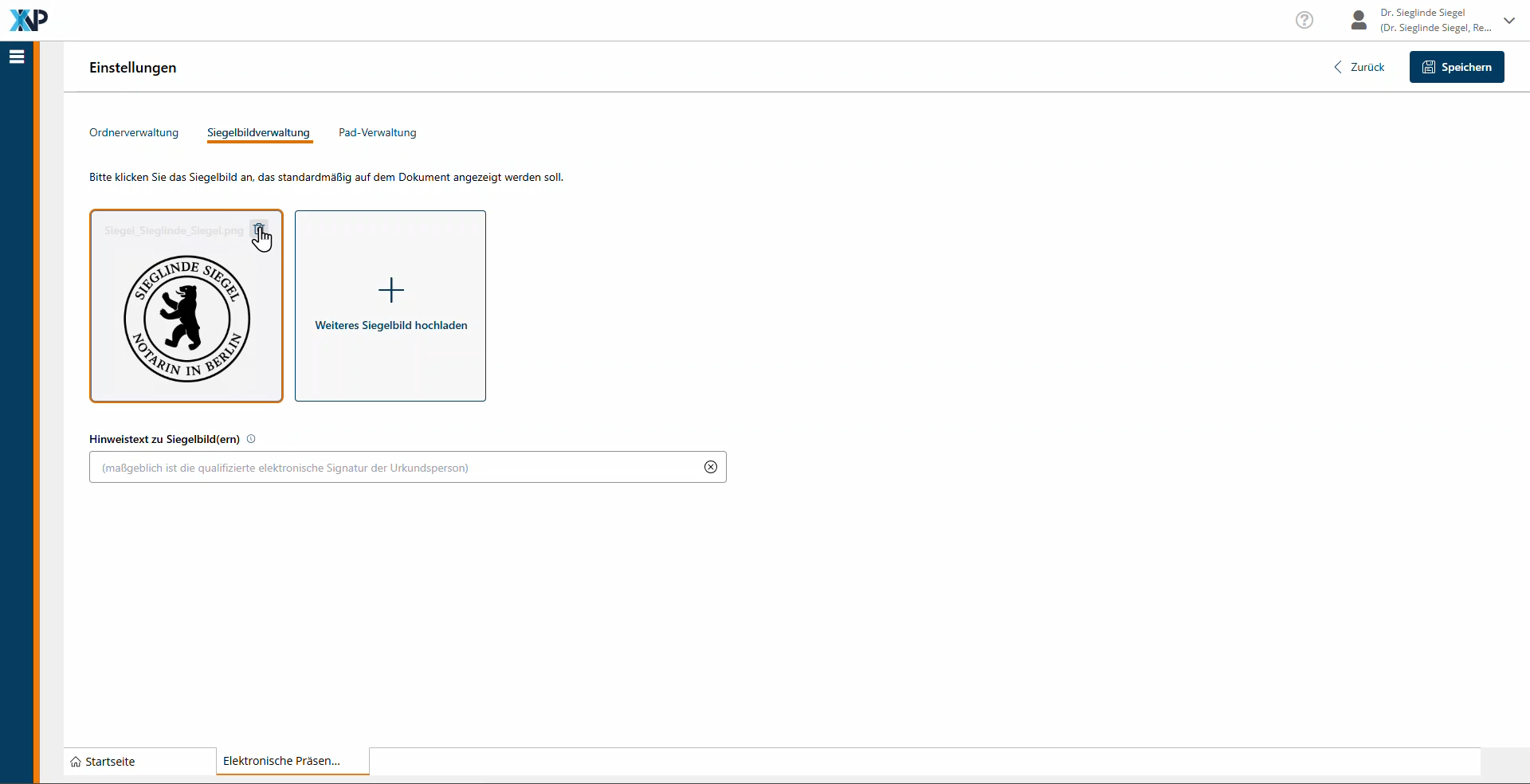 | Mit dieser Funktion können der Anwendung Siegelbilder zugeführt werden. Bei einem Siegelbild handelt es sich um eine grafische Wiedergabe des Amtssiegels ohne rechtliche Wirkung. Maßgeblich für die Rechtswirksamkeit der Urkunde ist allein die qualifizierte elektronische Signatur der Notarin oder des Notars. |