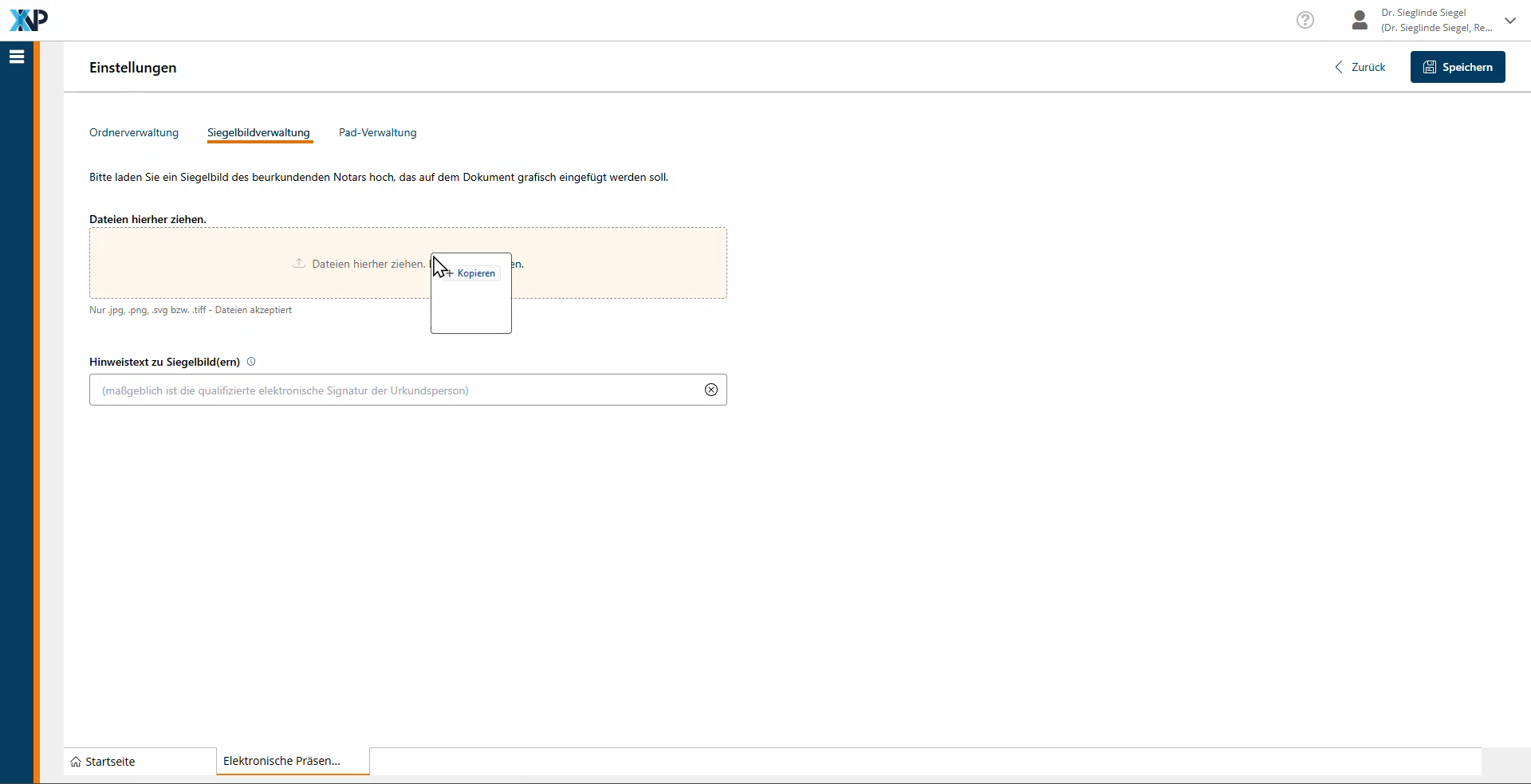 Per „Drag & Drop" oder Klick auf Datei auswählen können Sie ein Bild auswählen. Dieses wird standardmäßig bei der Erstellung von notarseitigen Signaturen verwendet.