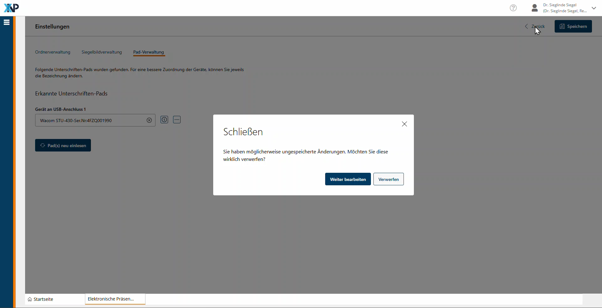Die Pad-Verwaltung kann auch mittels der Option Zurück beendet werden. Sollten Sie das eingelesene Unterschriften-Pad noch nicht gespeichert haben, erhalten Sie einen entsprechenden Hinweis.