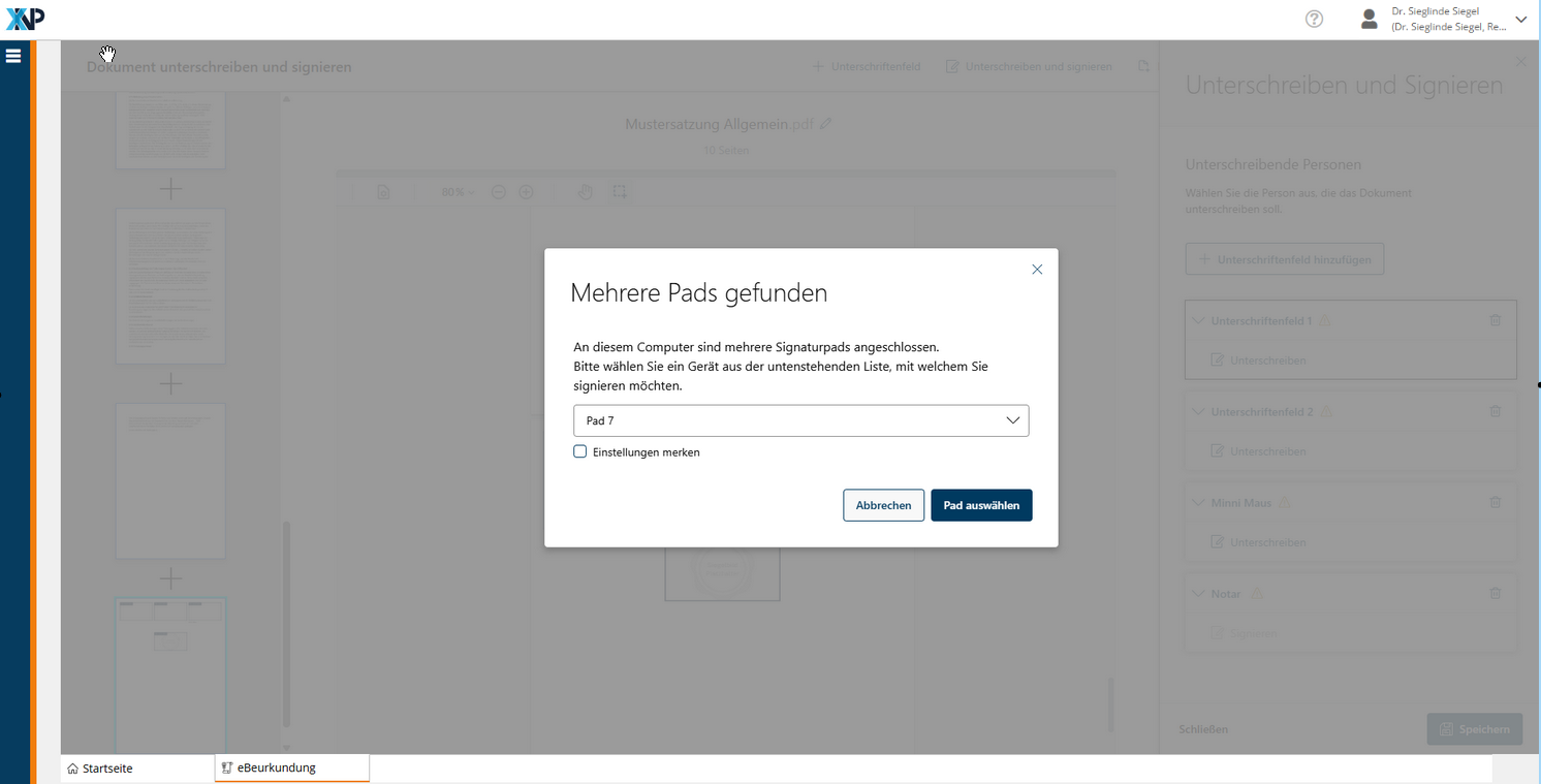 Es können auch mehrere Unterschriften-Pads verwendet werden. Bei der Aufforderung der Bürger zur Unterzeichnung wird die Notarin oder der Notar darauf hingewiesen, dass mehrere Pads angeschlossen sind. Hier kann die Notarin oder der Notar dann das entsprechende Unterschriften-Pad auswählen.