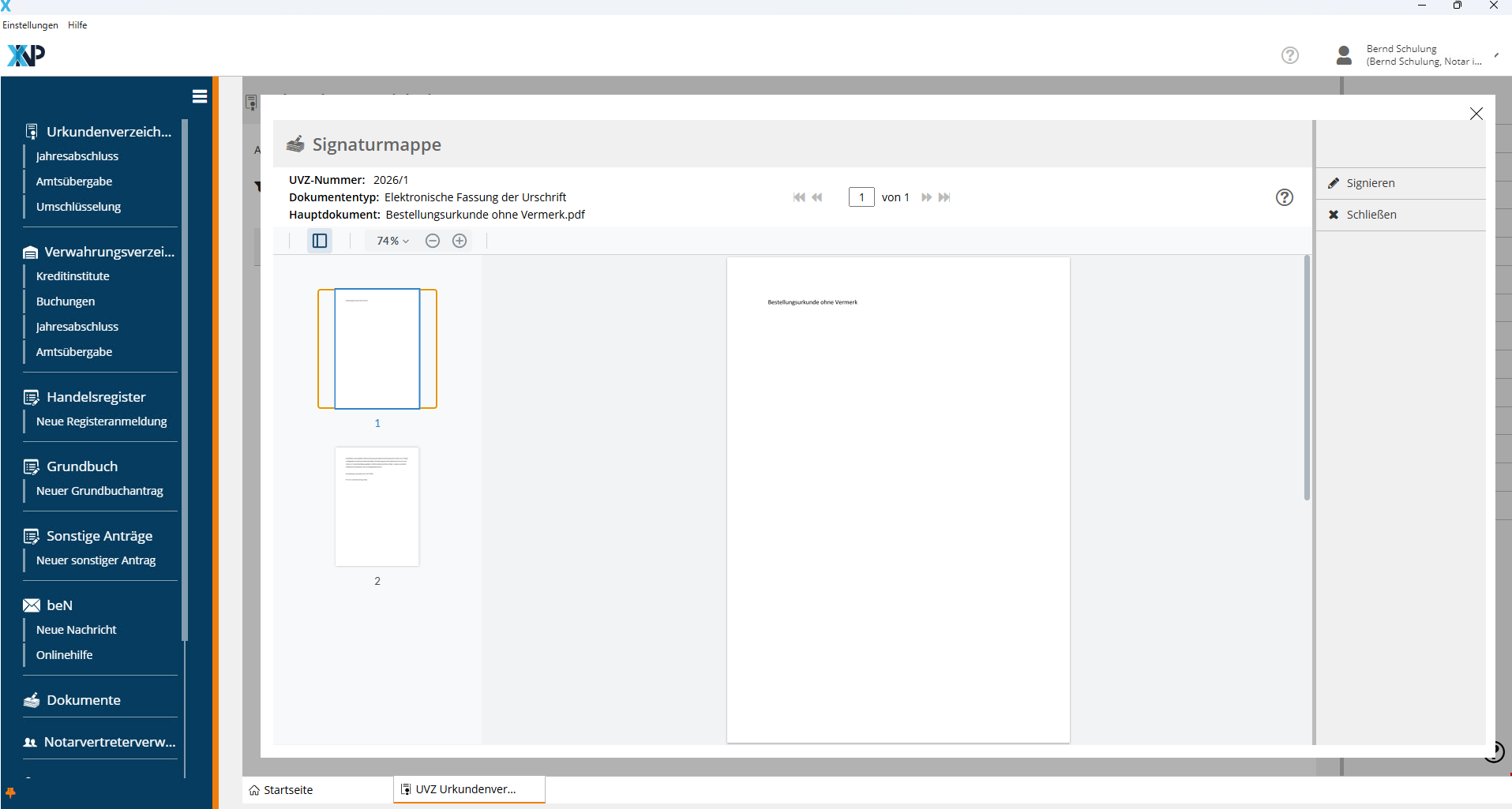 - Die Dokumente des gewählten UVZ-Eintrags werden zur Signatur vorbereitet. Die Signaturmappe öffnet sich.