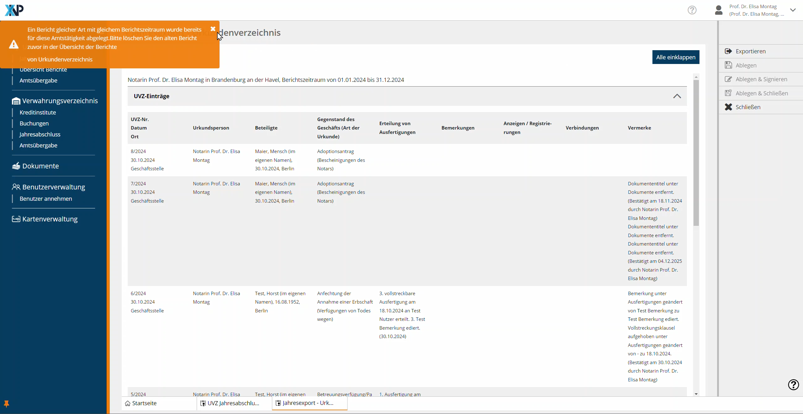 Es öffnet sich der Reiter Jahresexport – Urkundenverzeichnis.