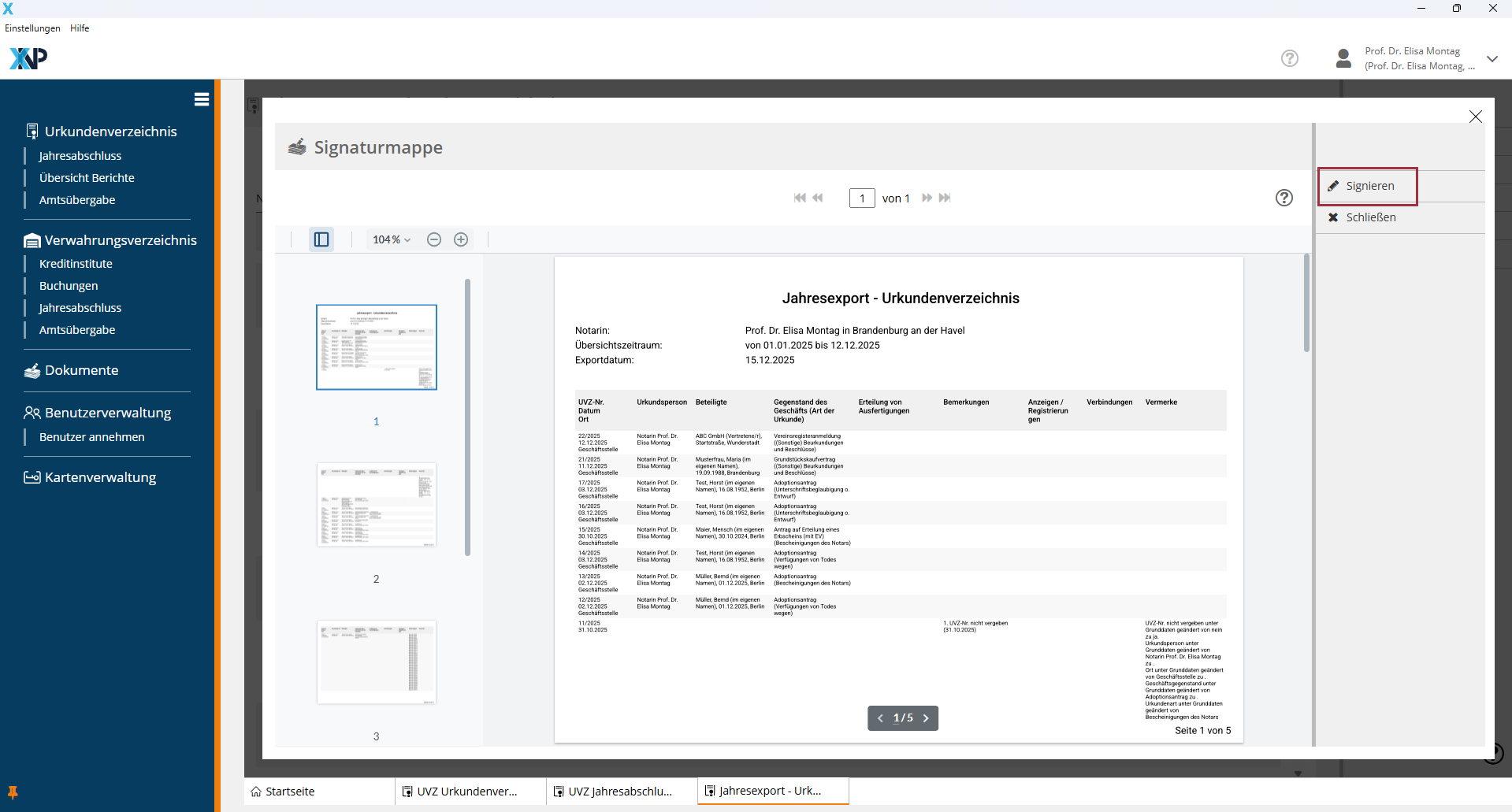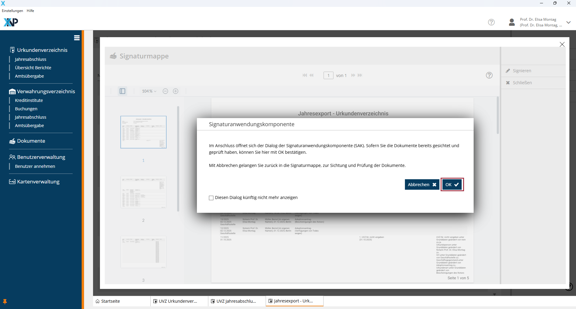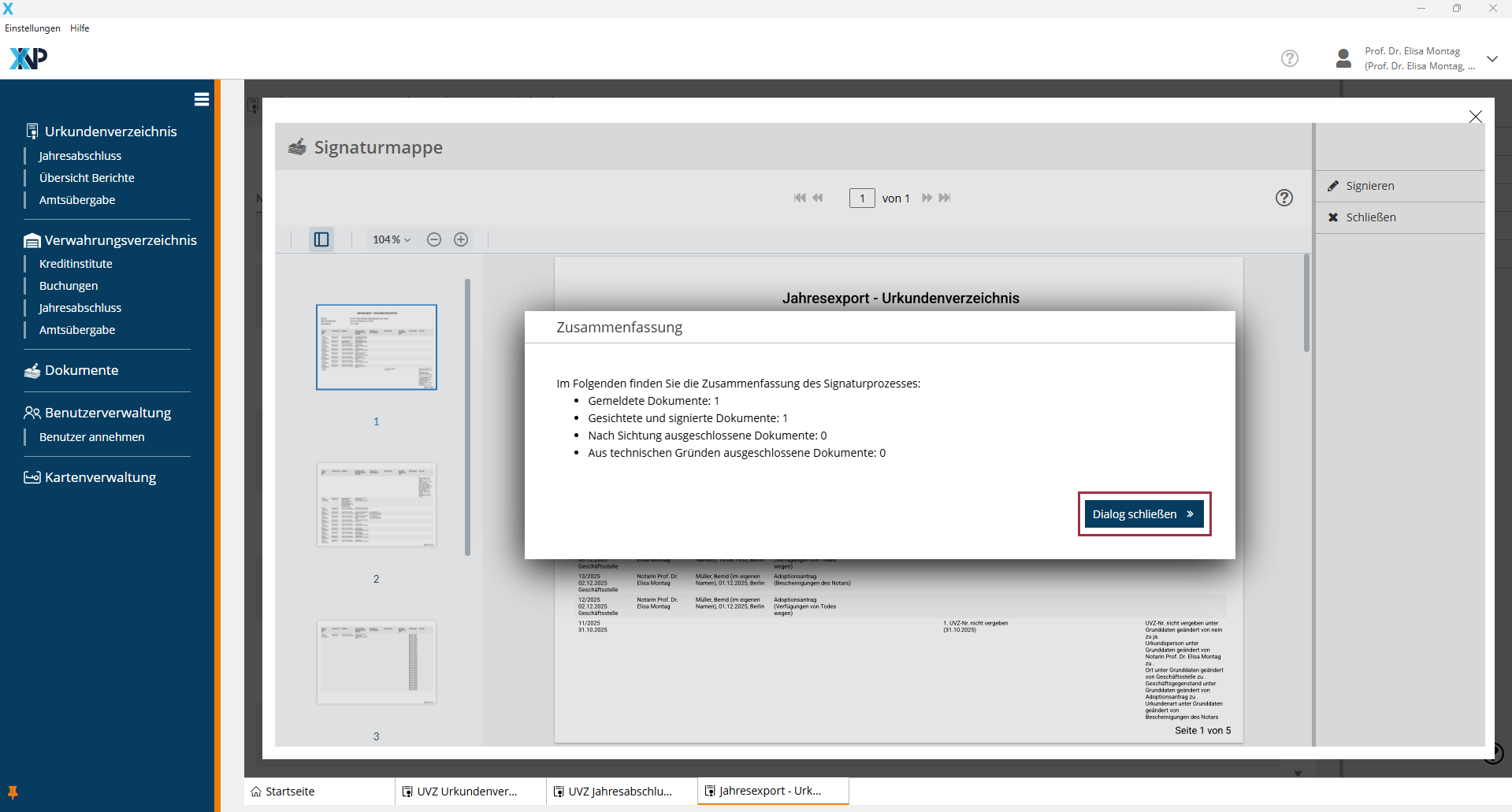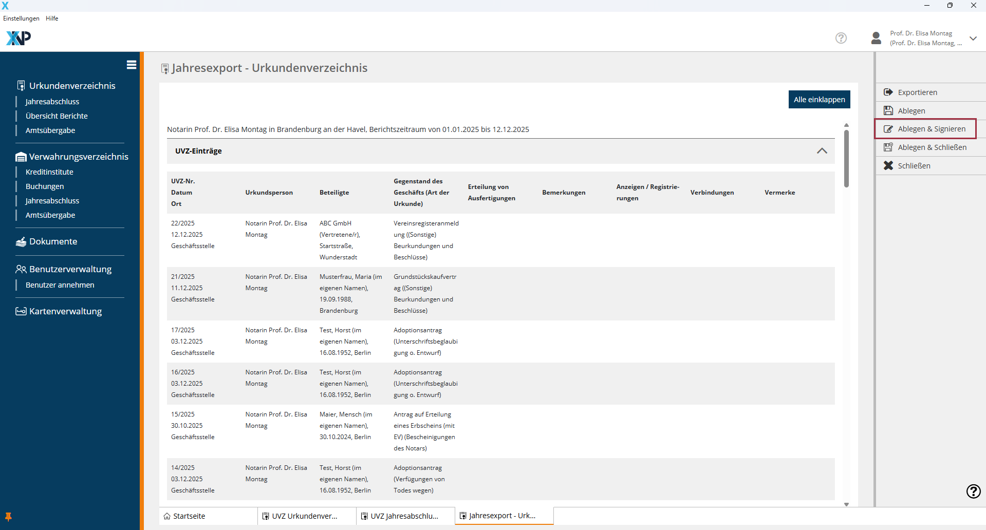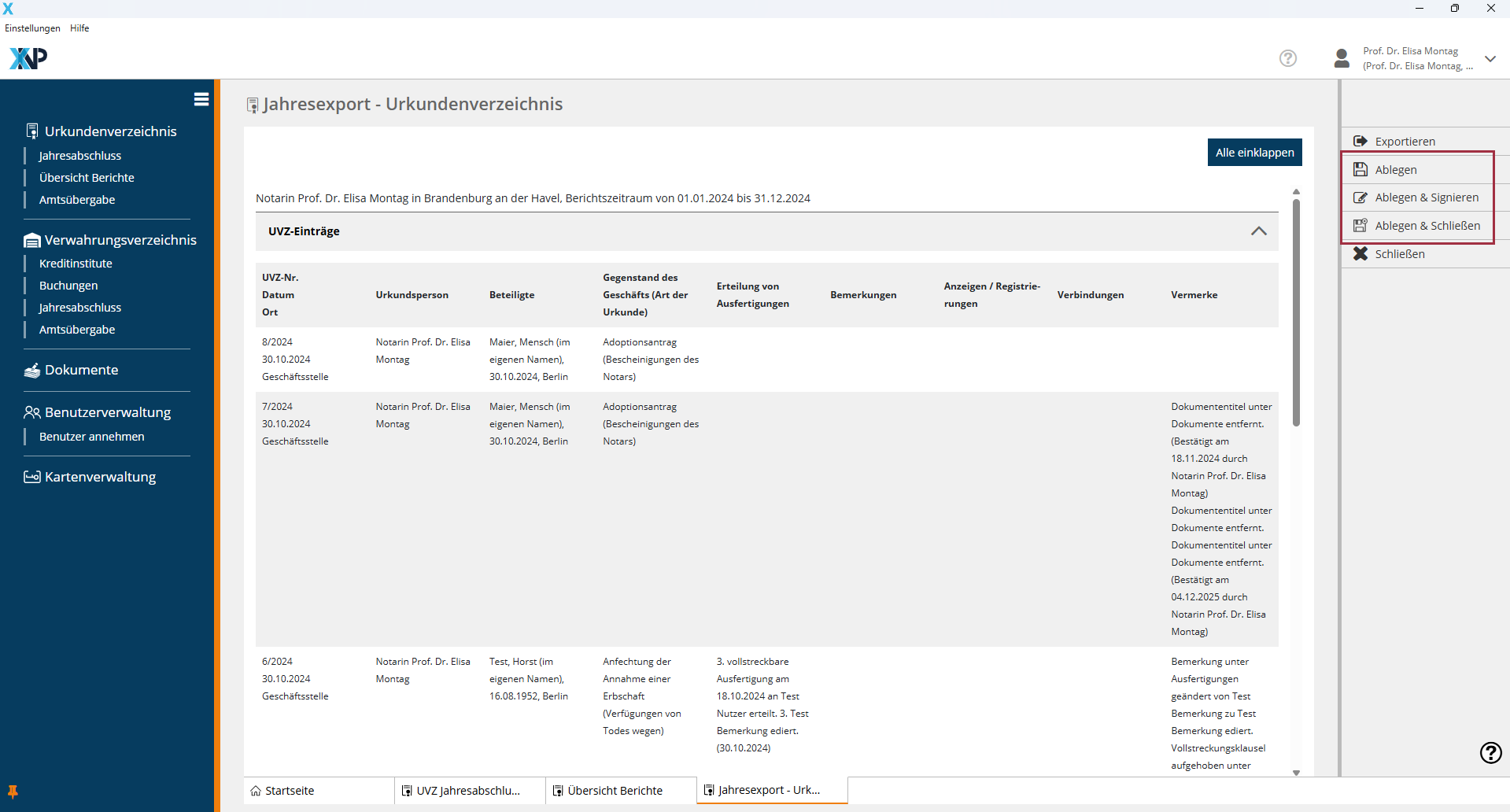 Um den Export über die Eintragungen im Urkundenverzeichnis zu archivieren, haben Sie die Möglichkeit, den Jahresexport über Ablegen & Signieren (1.) zu signieren und unmittelbar zu archivieren. Alternativ können Sie den Export über die Funktion Ablegen (2.) oder Ablegen & Schließen (3.) zunächst ablegen und diesen zu einem späteren Zeitpunkt signieren und archivieren.