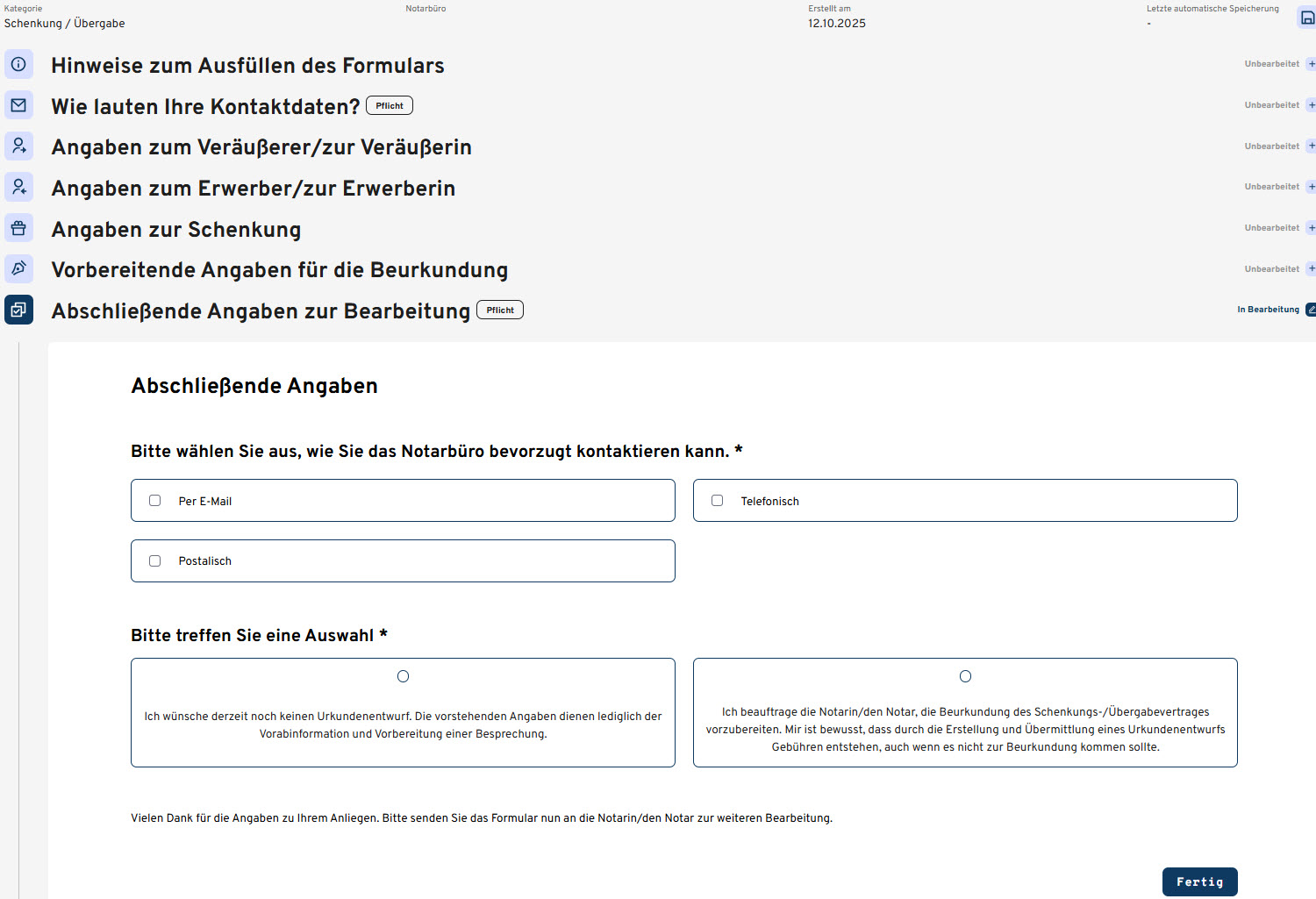 ob Sie die Daten lediglich vorab zur Information und Vorbereitung einer Besprechung übermitteln oder direkt die Erstellung eines Urkundenentwurfs beauftragen.