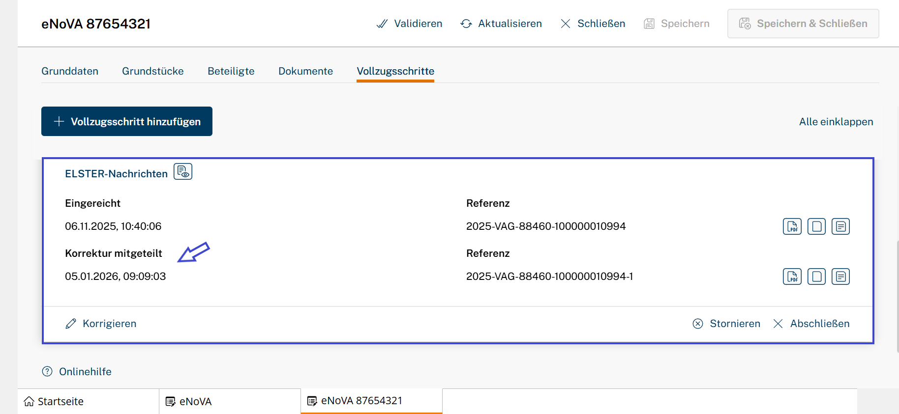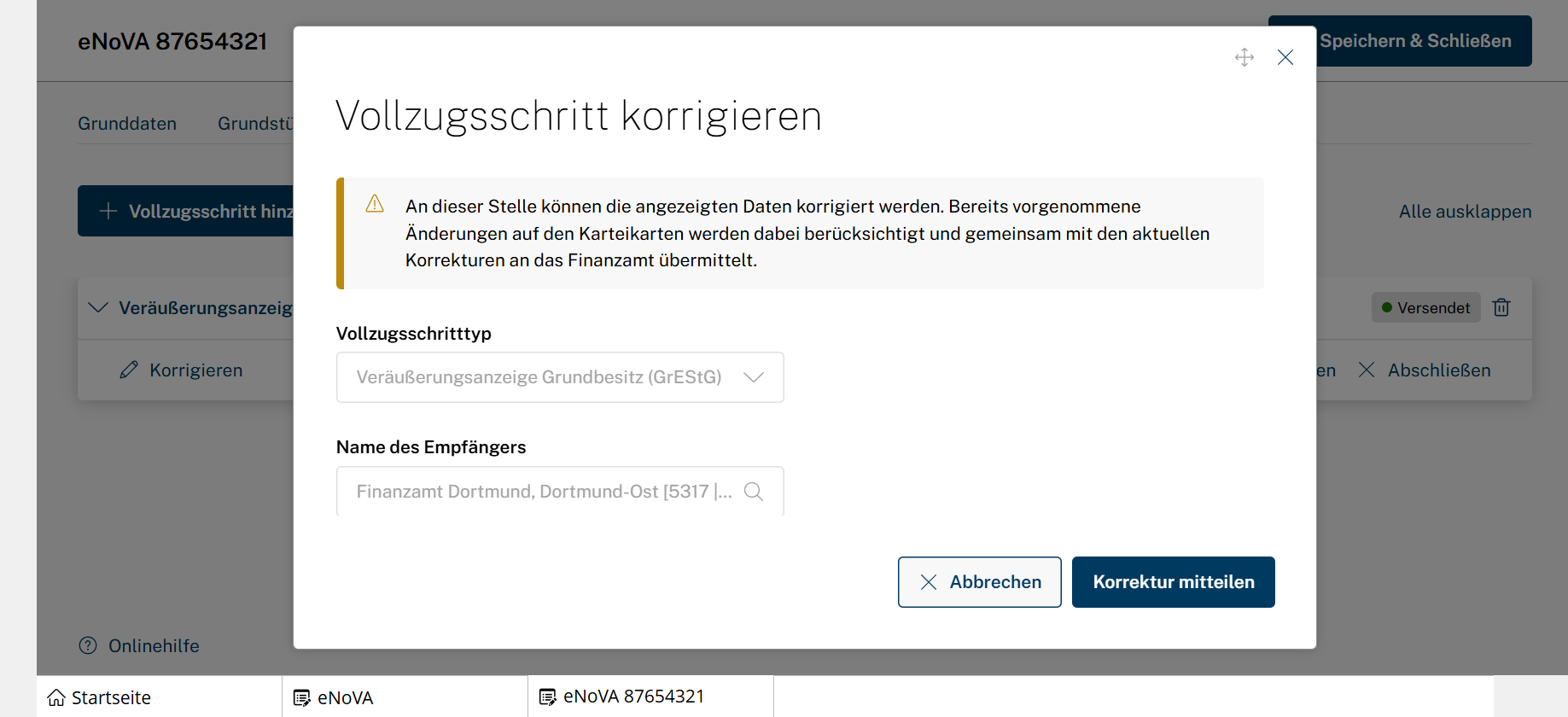 - Bereits vorgenommene Änderungen auf den Karteikarten des Vorgangs, z.B. Hinzufügen eines weiteren Beteiligten, werden mit Klick auf Korrektur mitteilen berücksichtigt und an das Finanzamt übersandt.