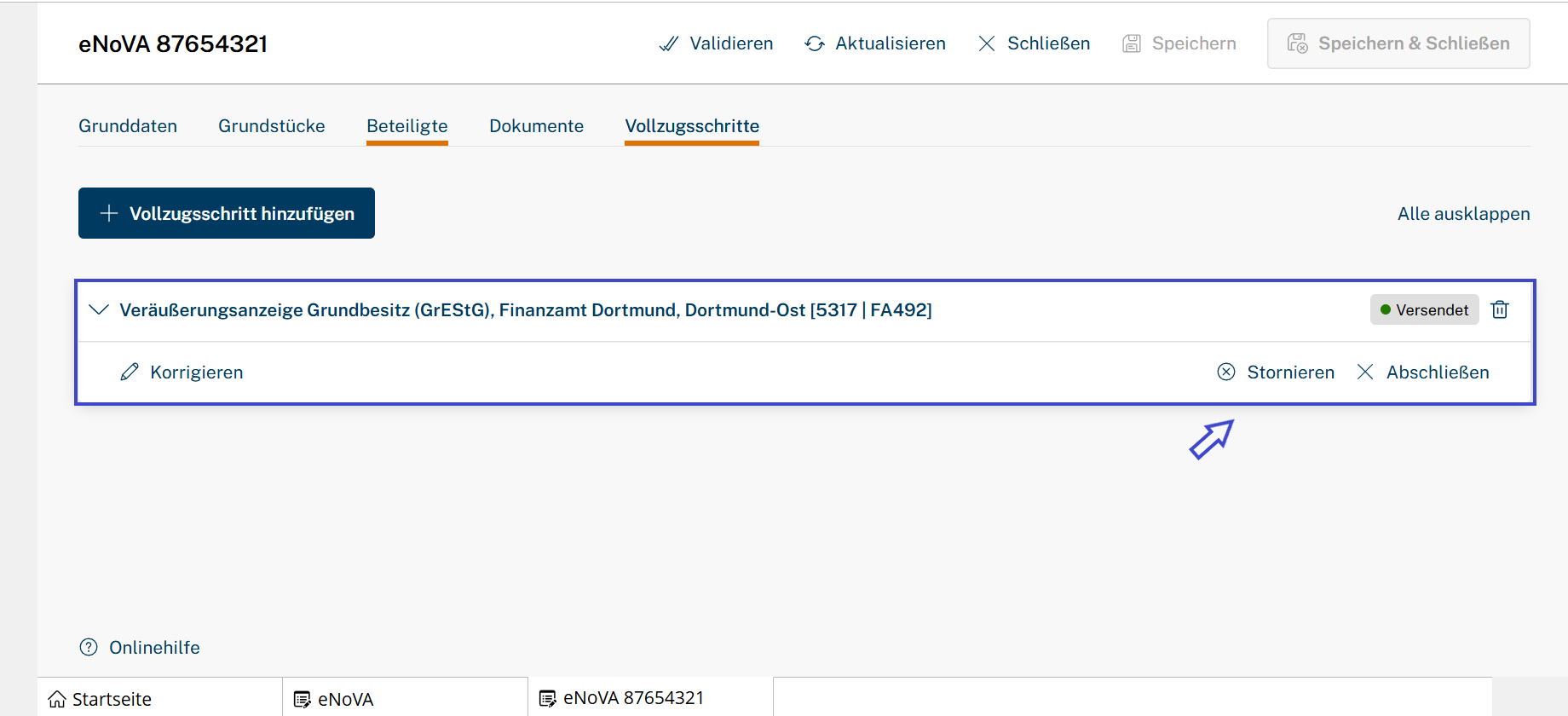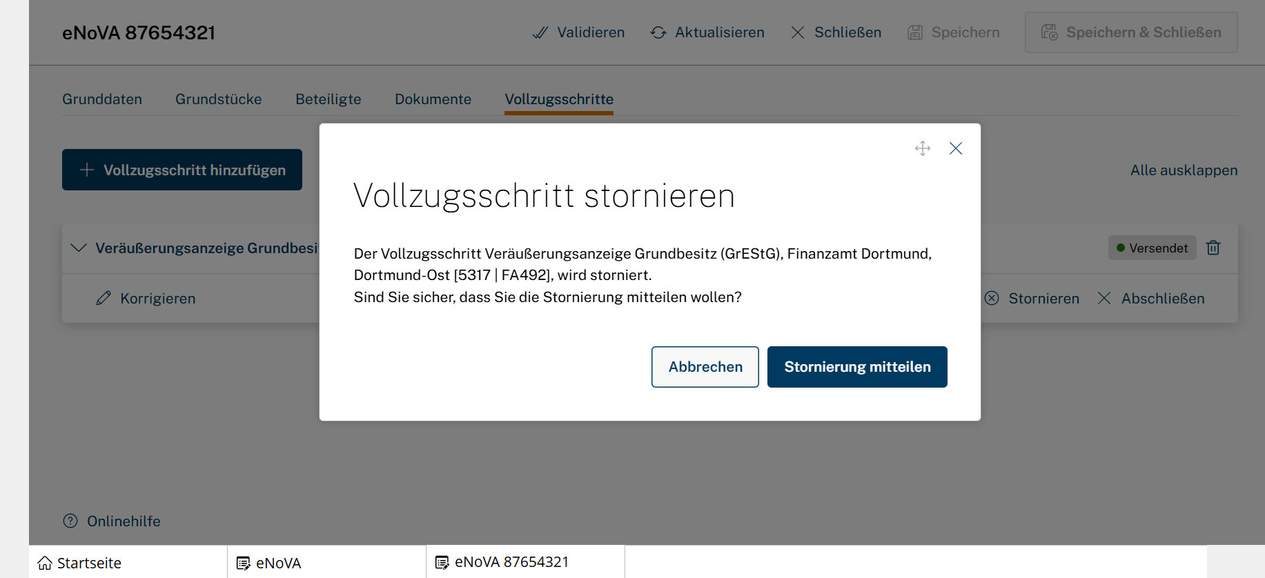 Die Rückabwicklung eines gescheiterten Grundstücksgeschäfts (z. B. Aufhebung des Kaufvertrages) ist kein Fall für eine Stornierung über das Modul eNoVA. Eine notwendige Kommunikation erfolgt in diesen Fällen weiterhin außerhalb von eNoVA.