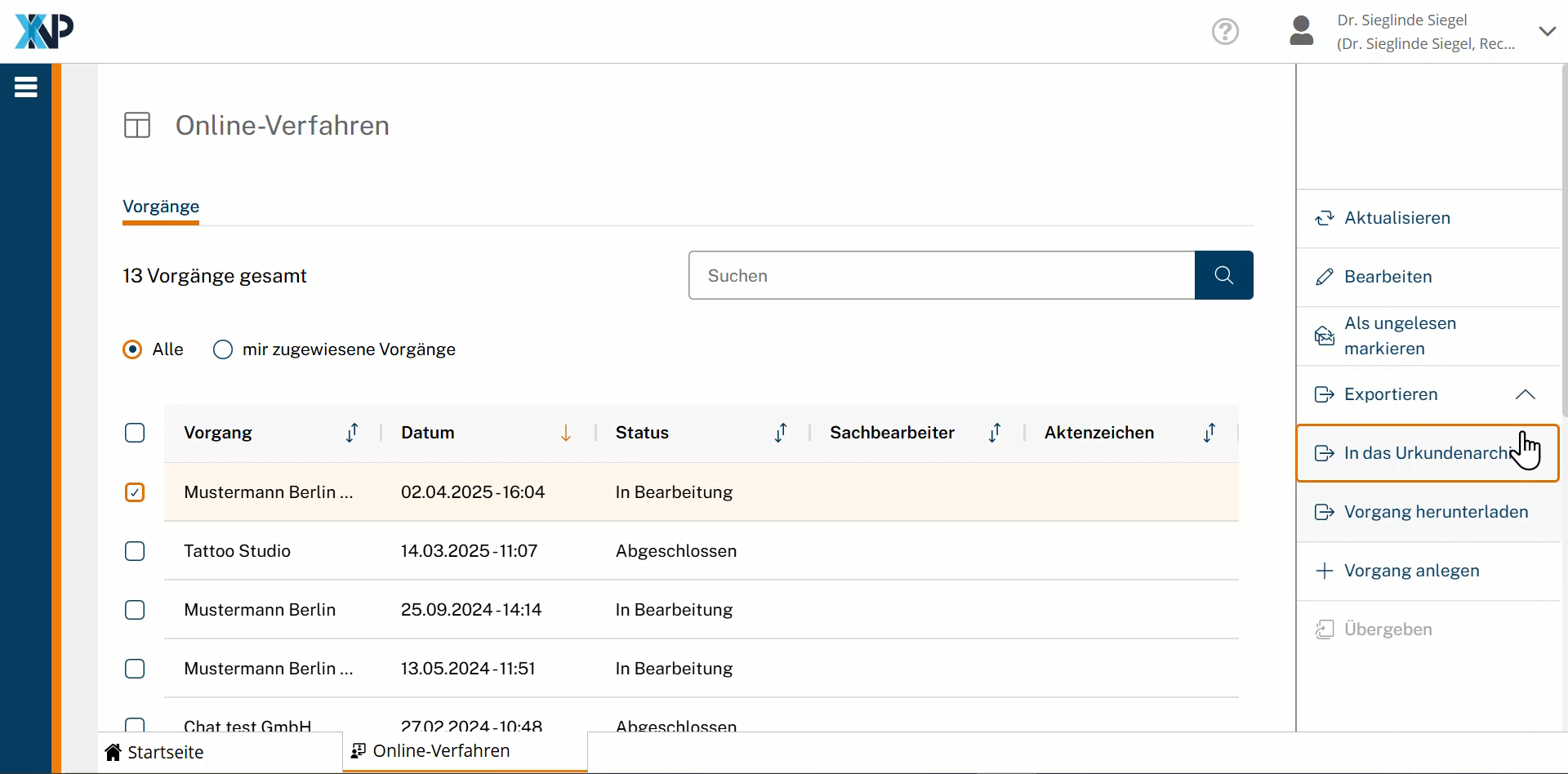 Klicken Sie in der Aktionsleiste auf die Schaltfläche Exportieren und wählen anschließend In das Urkundenarchiv aus.