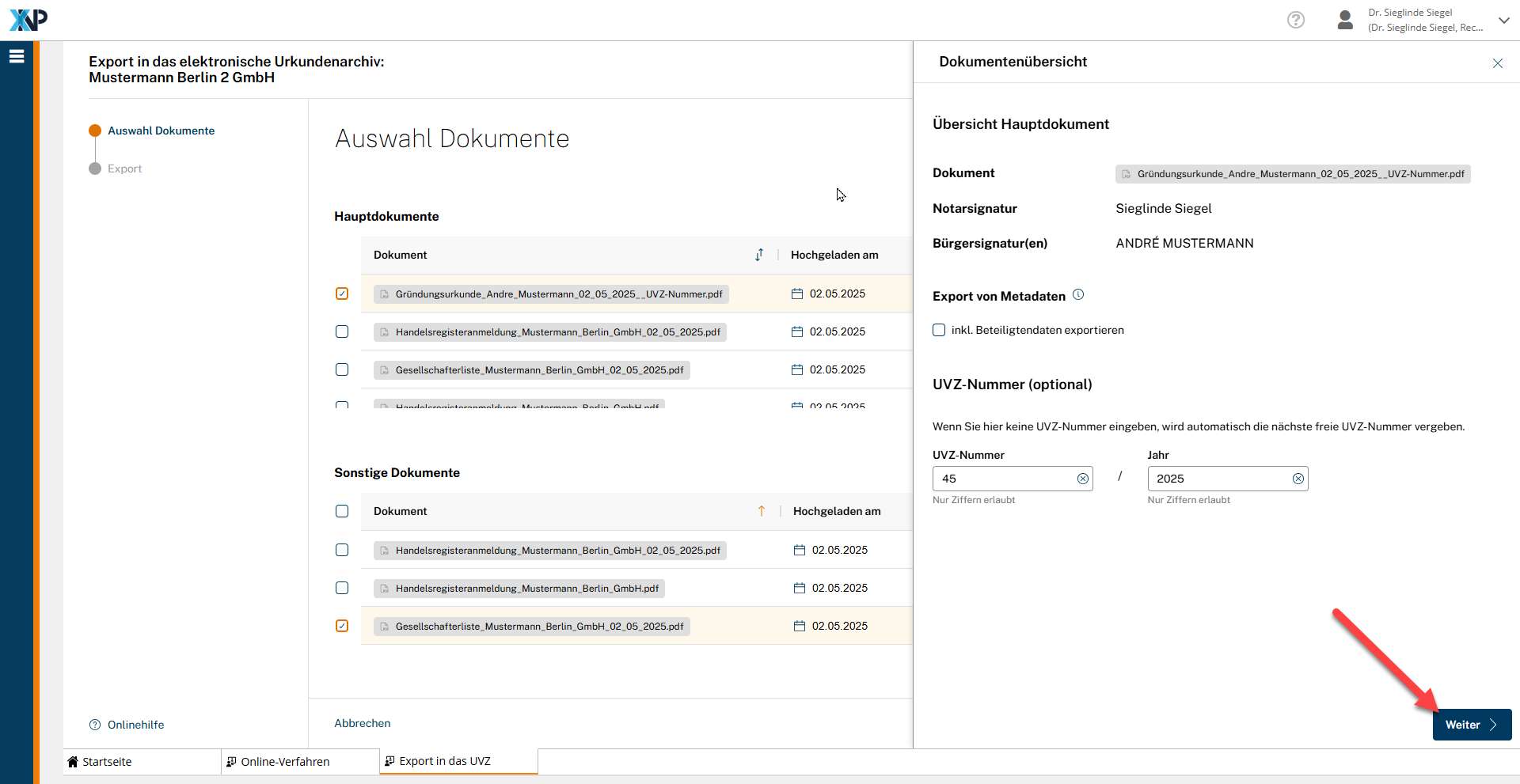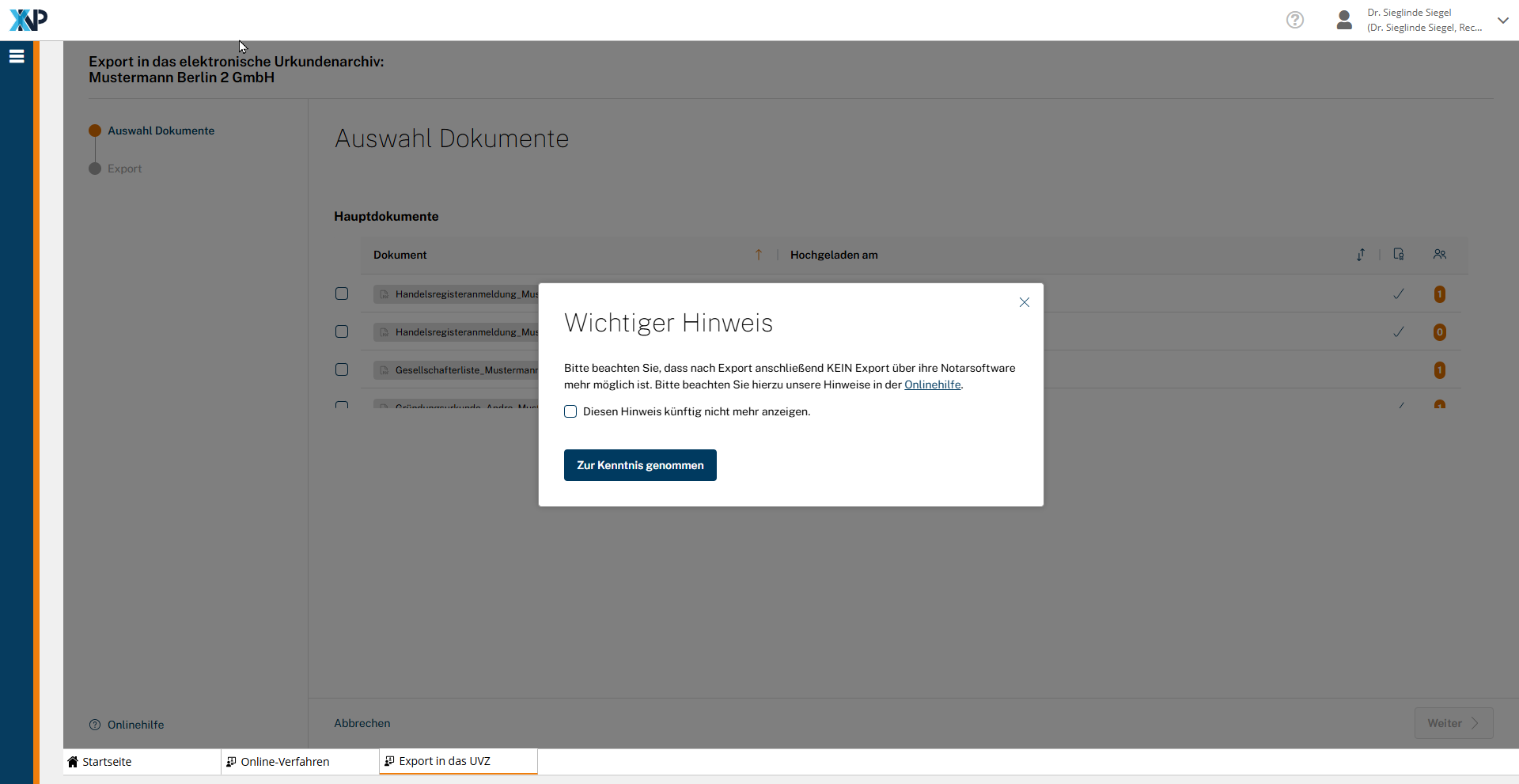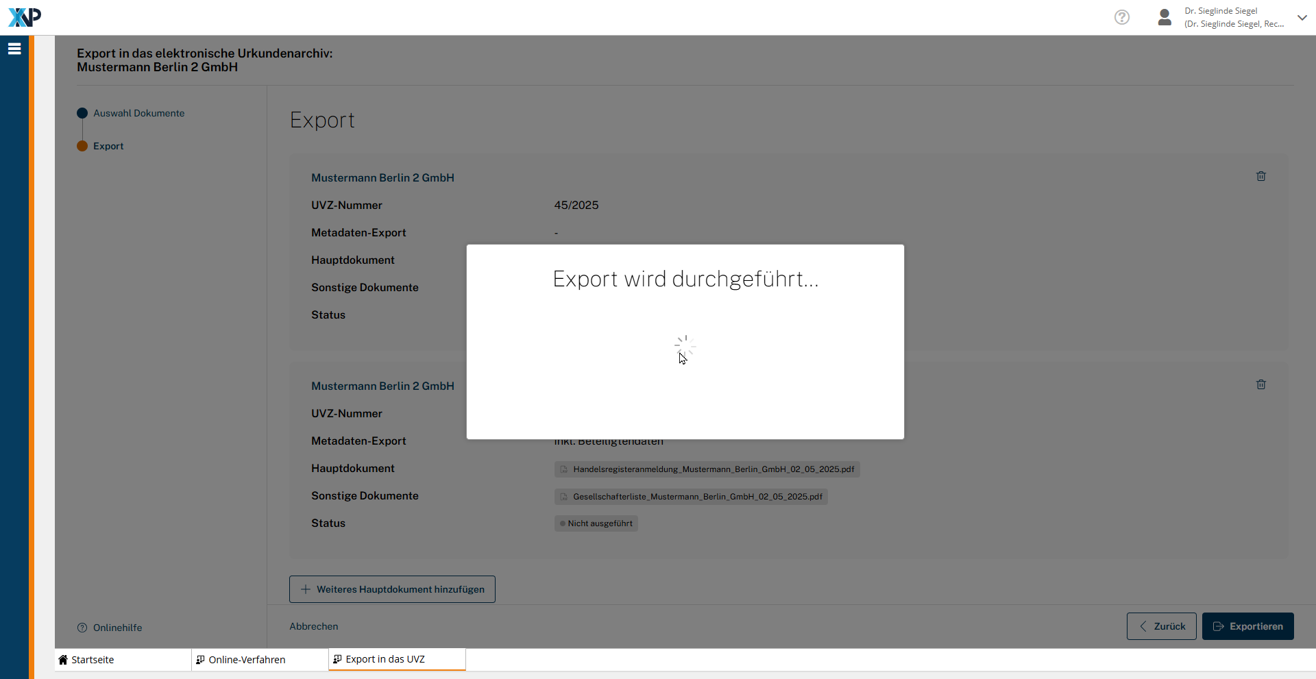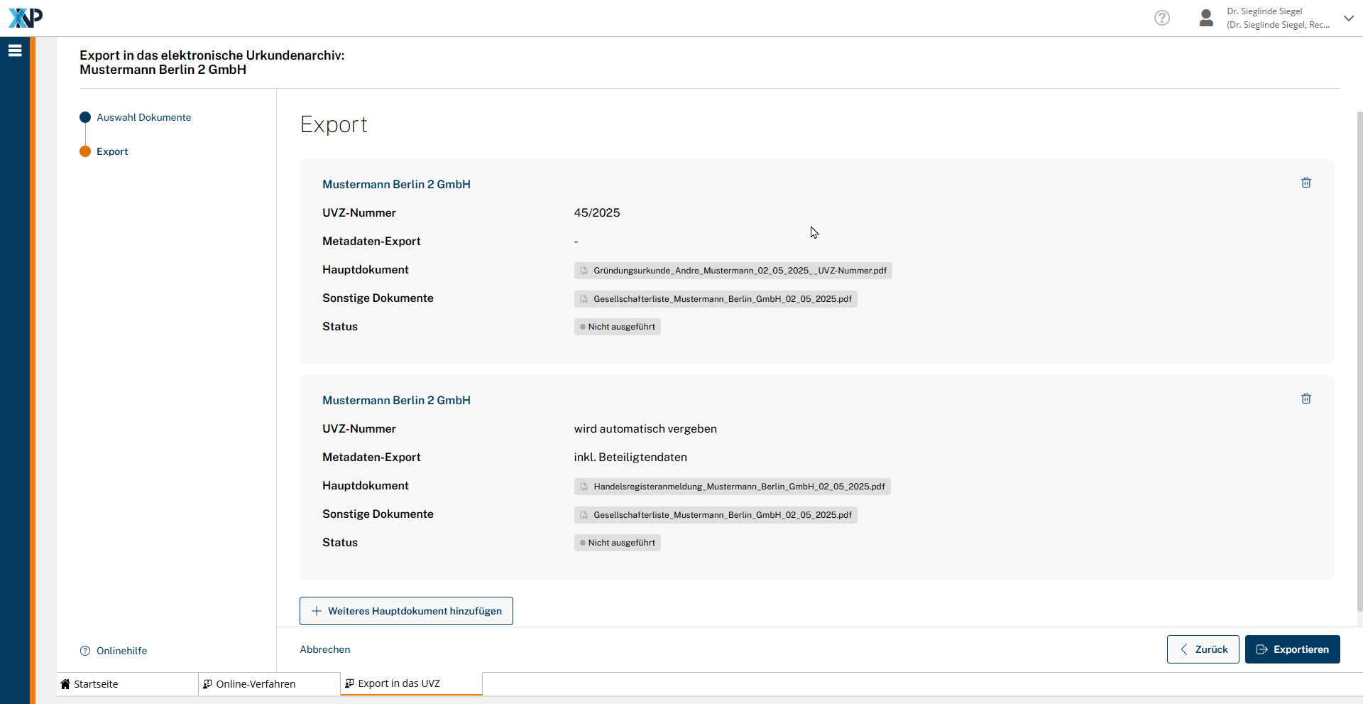 Export von Daten und Dokumenten aus den Online-Verfahren in das Urkundenverzeichnis