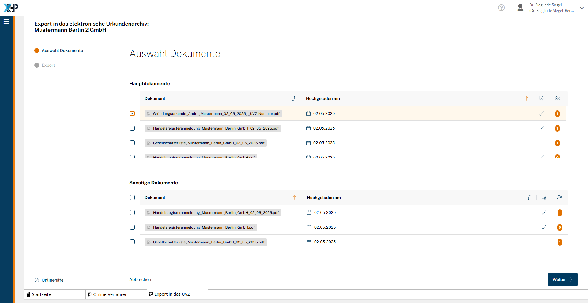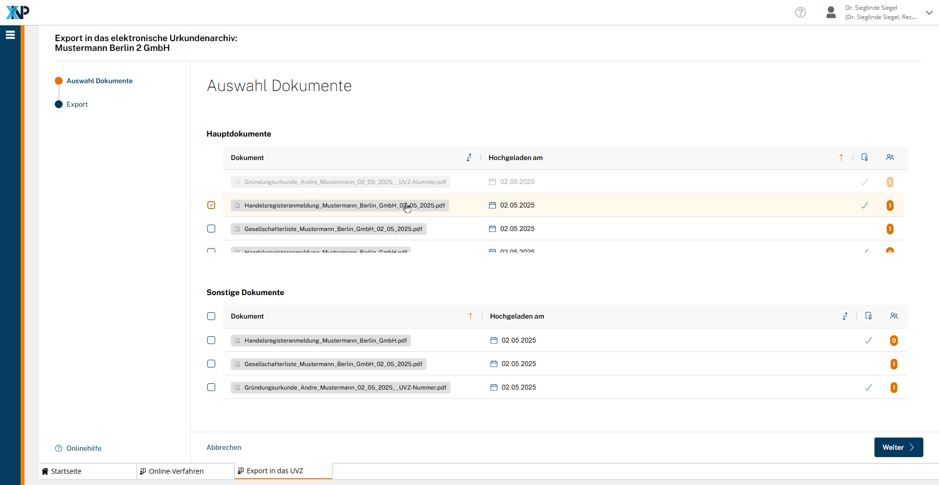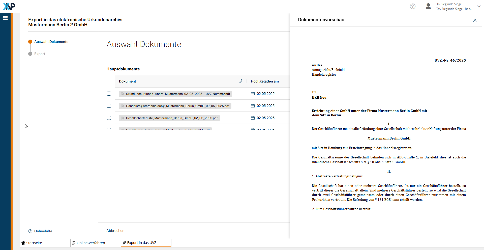 Bei einer GmbH-Gründung können Sie bspw. neben dem Gründungsprotokoll auch die Handelsregisteranmeldung auswählen und beide Dokumente gemeinsam in das Urkundenverzeichnis exportieren.