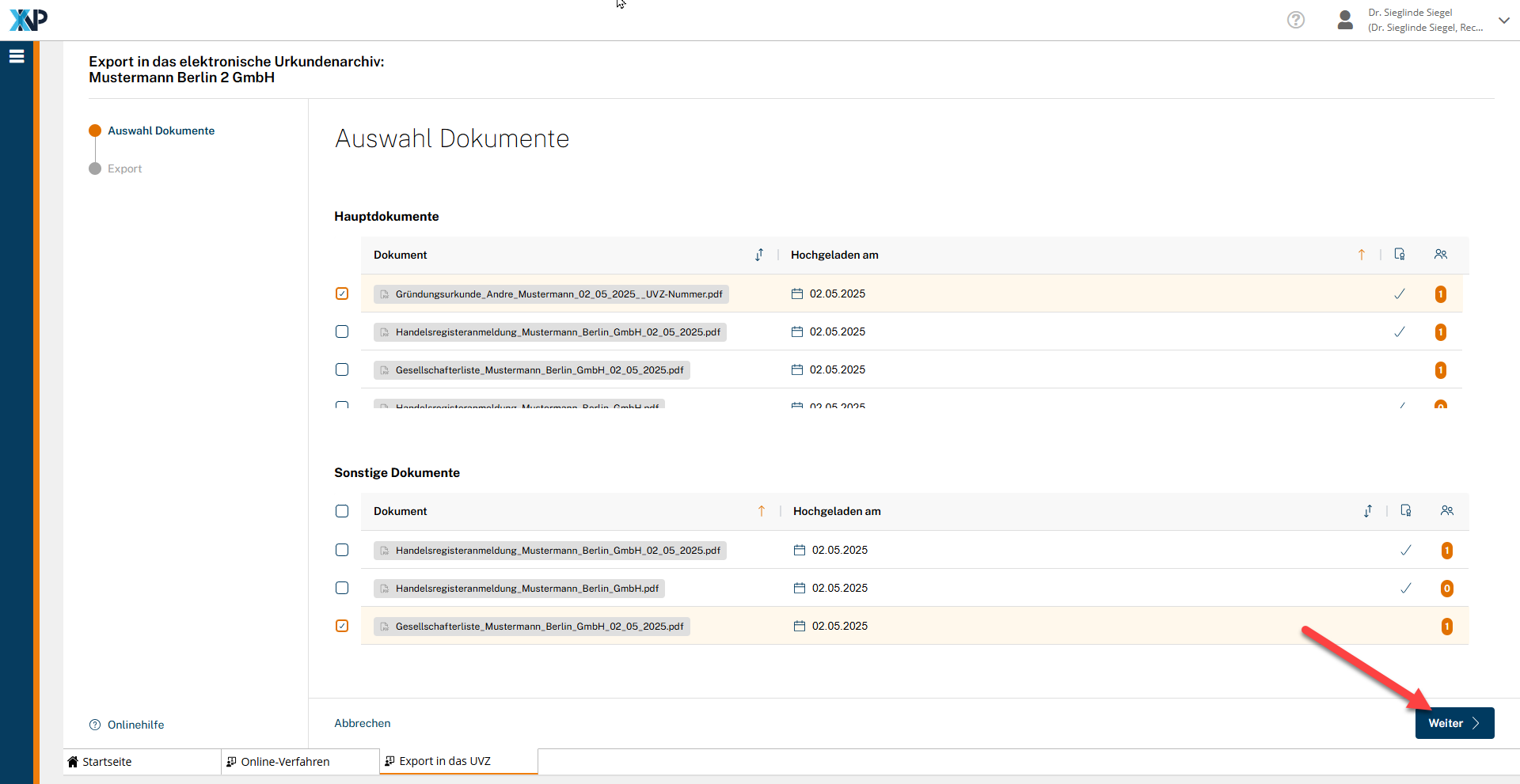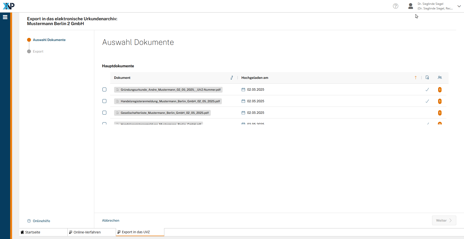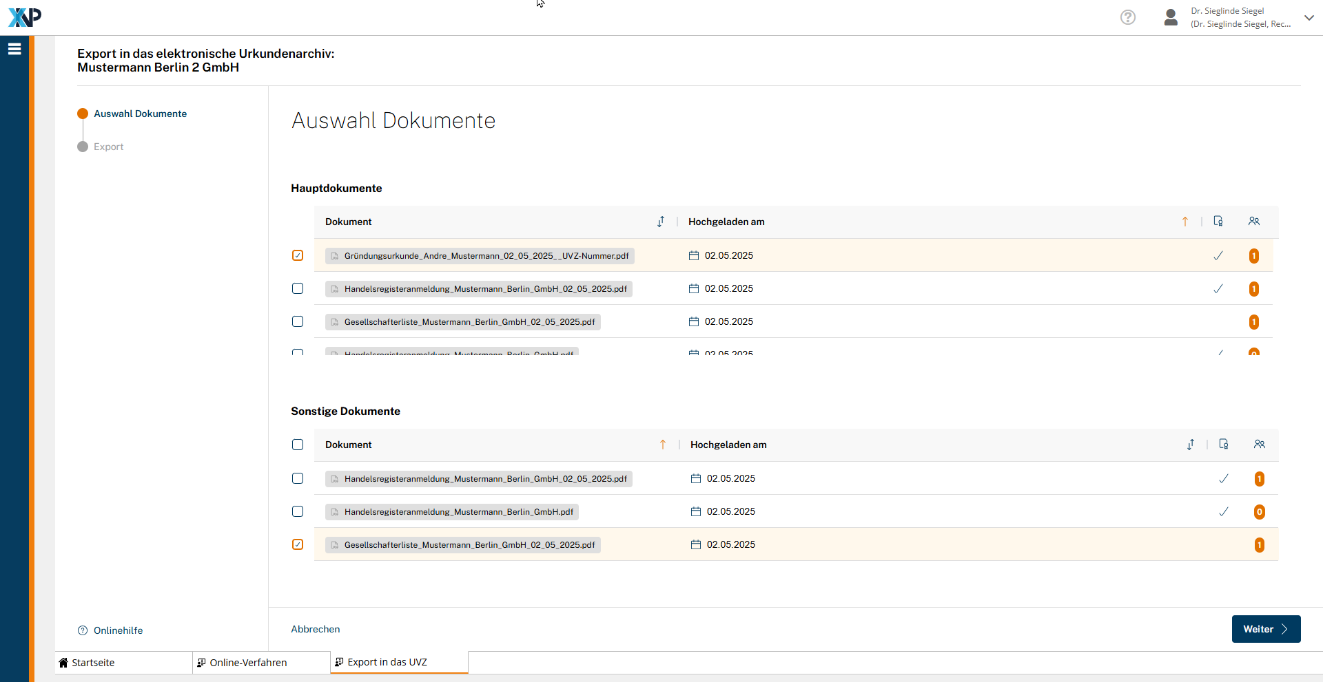 Bei einer GmbH-Gründung können Sie bspw. neben dem Gründungsprotokoll auch die Handelsregisteranmeldung auswählen und beide Dokumente gemeinsam in das Urkundenverzeichnis exportieren.