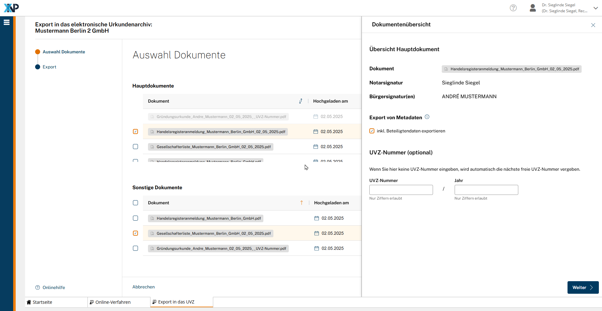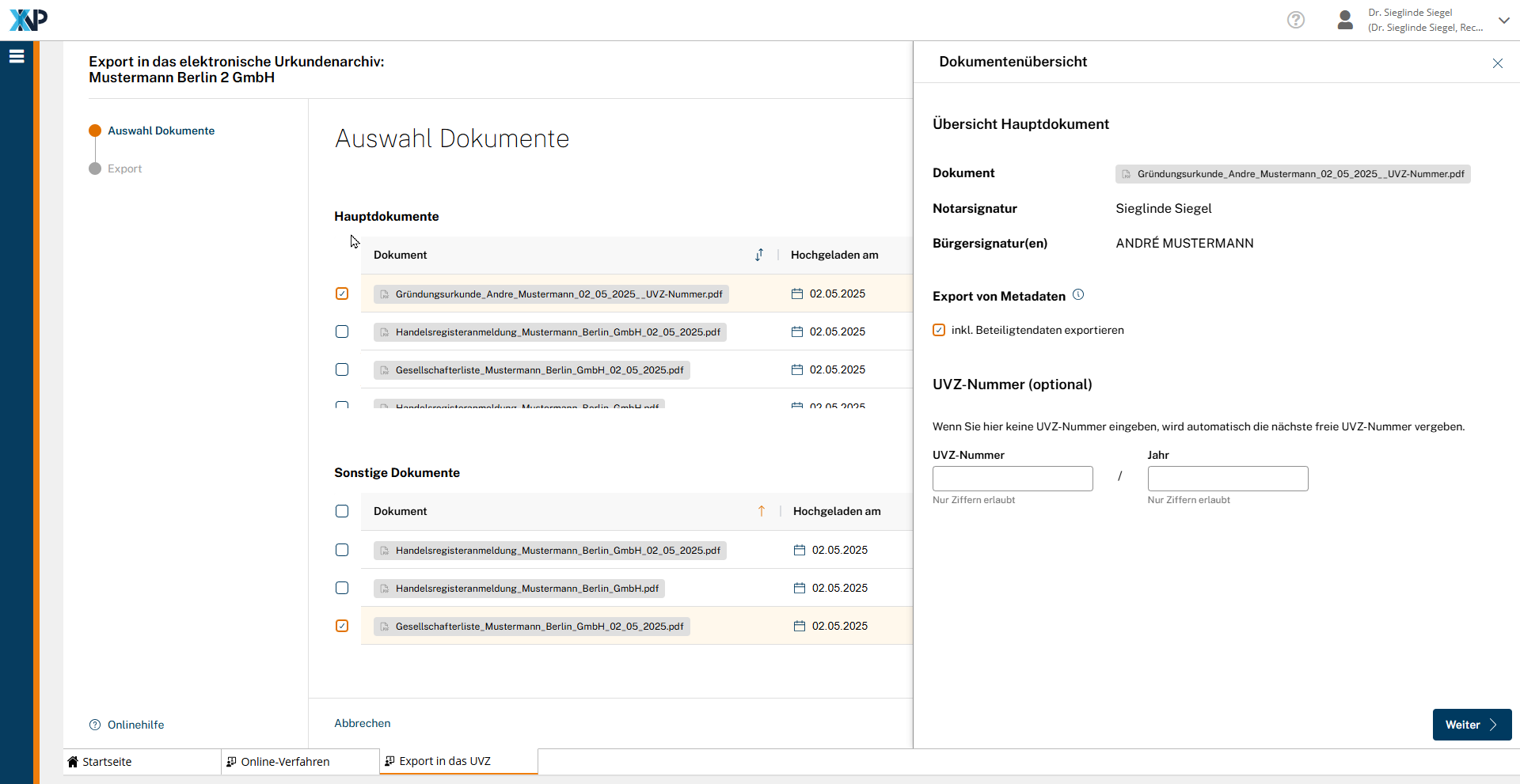 Haben Sie bereits einen UVZ-Eintrag angelegt, in dem Sie die Daten der Beteiligen und des Vorgangs mithilfe einer Notarsoftware in das UVZ importiert haben, empfehlen wir Ihnen, nur die Dokumente aus dem Online-Verfahren in das UVZ zu exportieren.