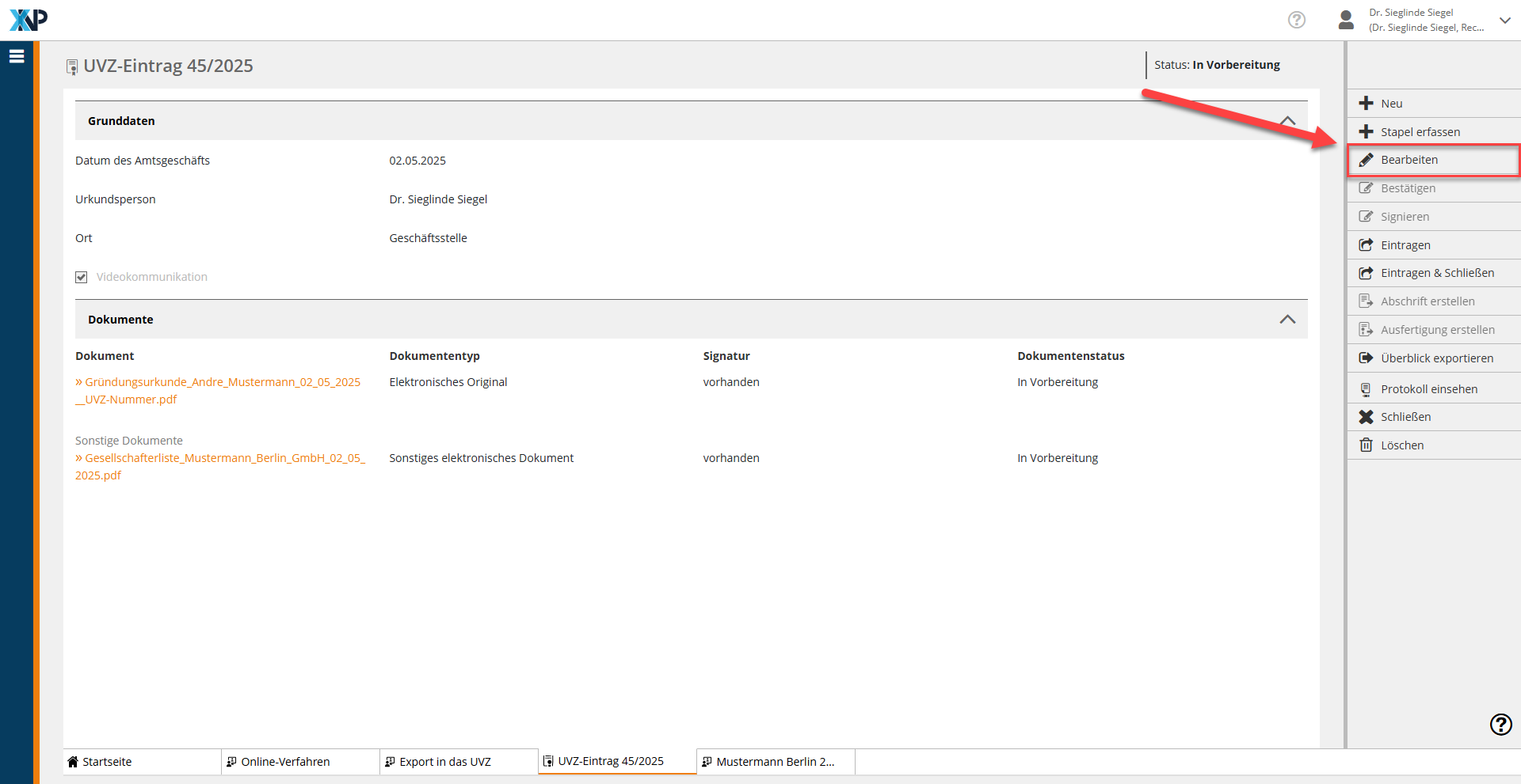 2.2 UVZ-Eintrag ist bereits angelegt und im Status "in Vorbereitung"