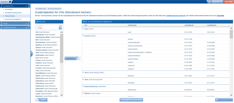 Unter dem Menüpunkt "Ortszuordnung" können Sie die Zuständigkeit für Geburtsorte für Ihr Standesamt einsehen und auf Richtigkeit prüfen. Sollten hier Abweichungen bestehen, teilen Sie dies bitte unter sta@testamentsregister.de mit.