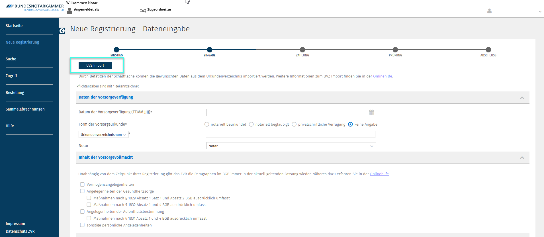 Auf der Dateneingabeseite finden Sie im oberen linken Bereich - über der Sektion “Daten der Vorsorgeverfügung” - den neuen Button “UVZ-Import”.