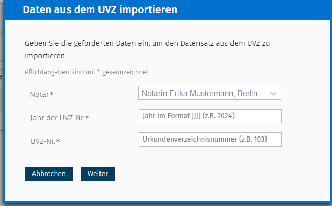 Bitte beachten Sie außerdem, dass der zu registrierende Vorgang im Urkundenverzeichnis (inkl. Beteiligtendaten, etc.) vorab angelegt und gespeichert sein muss. Eine Anleitung zur Erstellung eines neuen UVZ-Eintrags finden Sie in der Onlinehilfe im Kapitel UVZ-Eintrag anlegen.