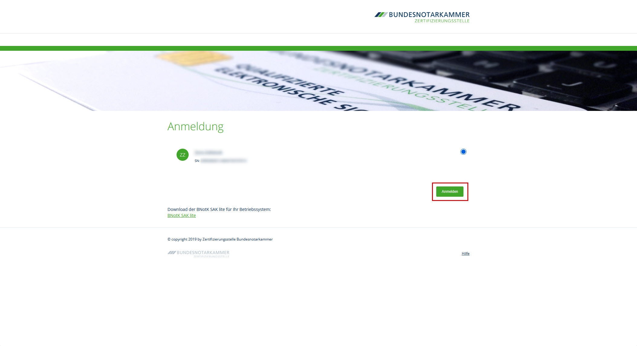 Es öffnet sich zunächst der Hinweis, dass für die Anmeldung mit Ihrer Chipkarte die Anwendung BNotK SAK lite erforderlich ist.