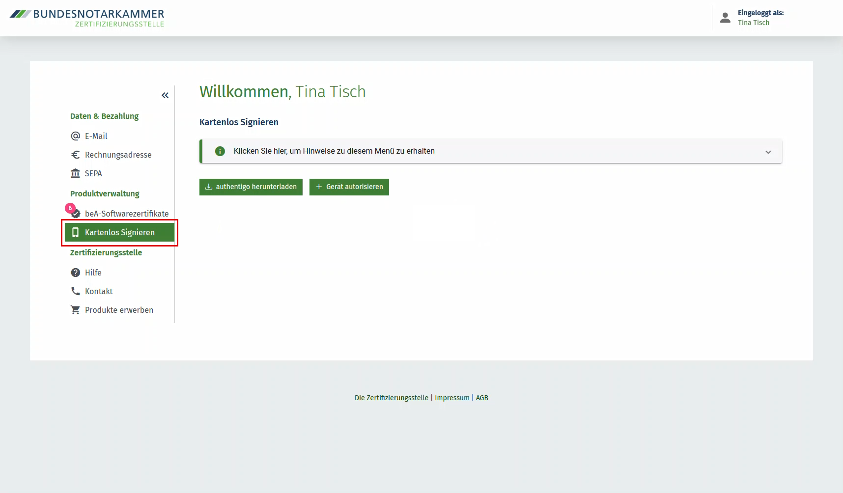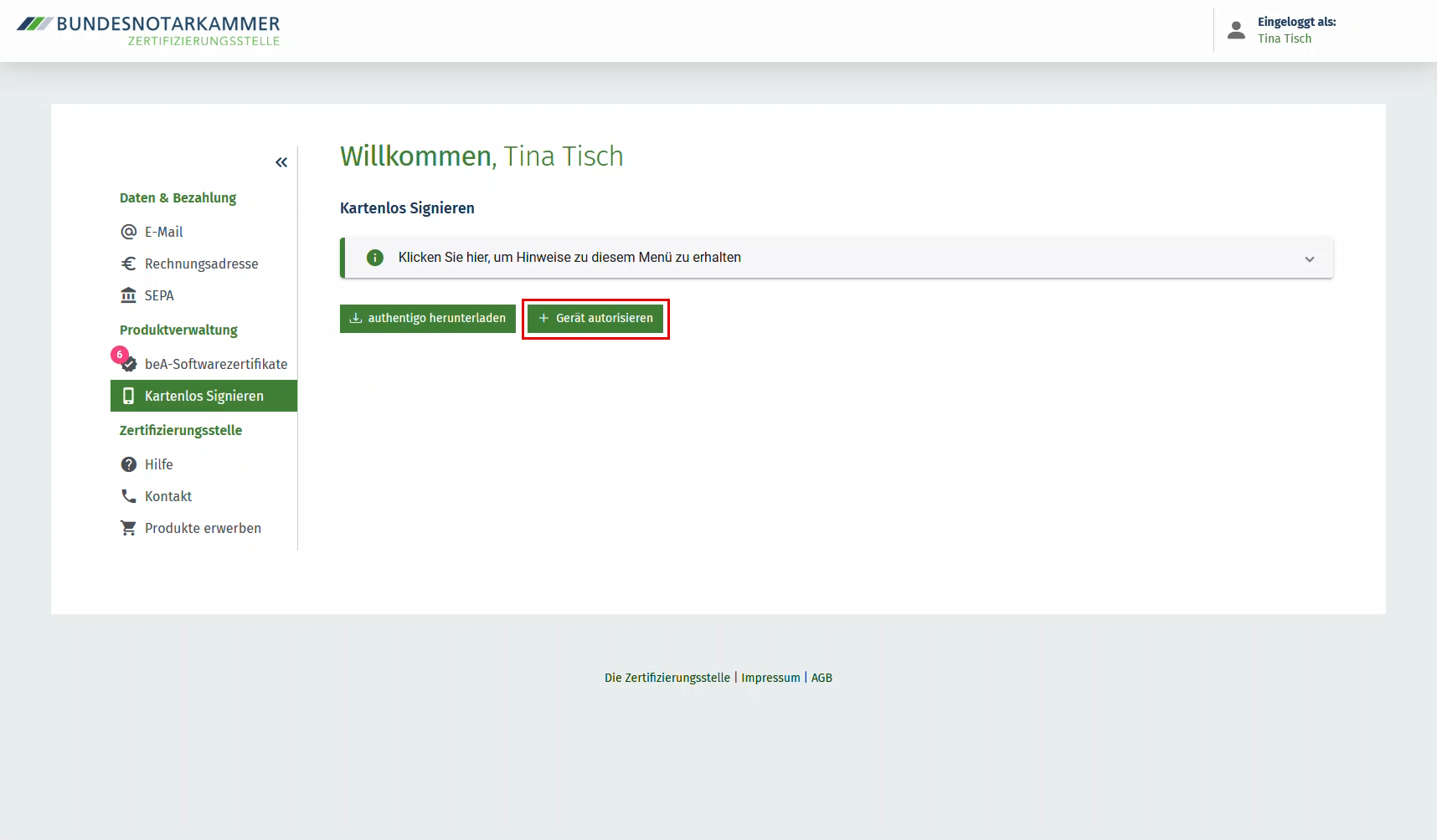 Um ein Endgerät für die Nutzung der Signatur-Freigabe App authentigo zu registrieren, müssen Sie sich zunächst einmalig mit Ihrer beA-Karte im Kundenportal der Zertifizierungsstelle anmelden.