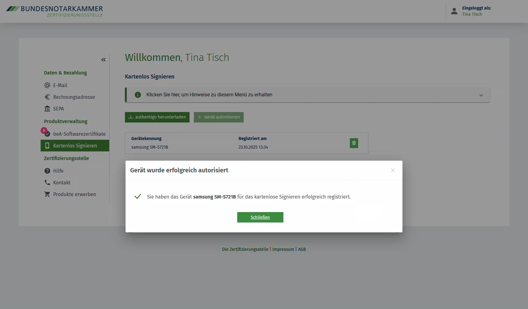Nach Bestätigung der Autorisierungsanfrage in der App erscheint im Kundenportal automatisch eine Erfolgsmeldung.