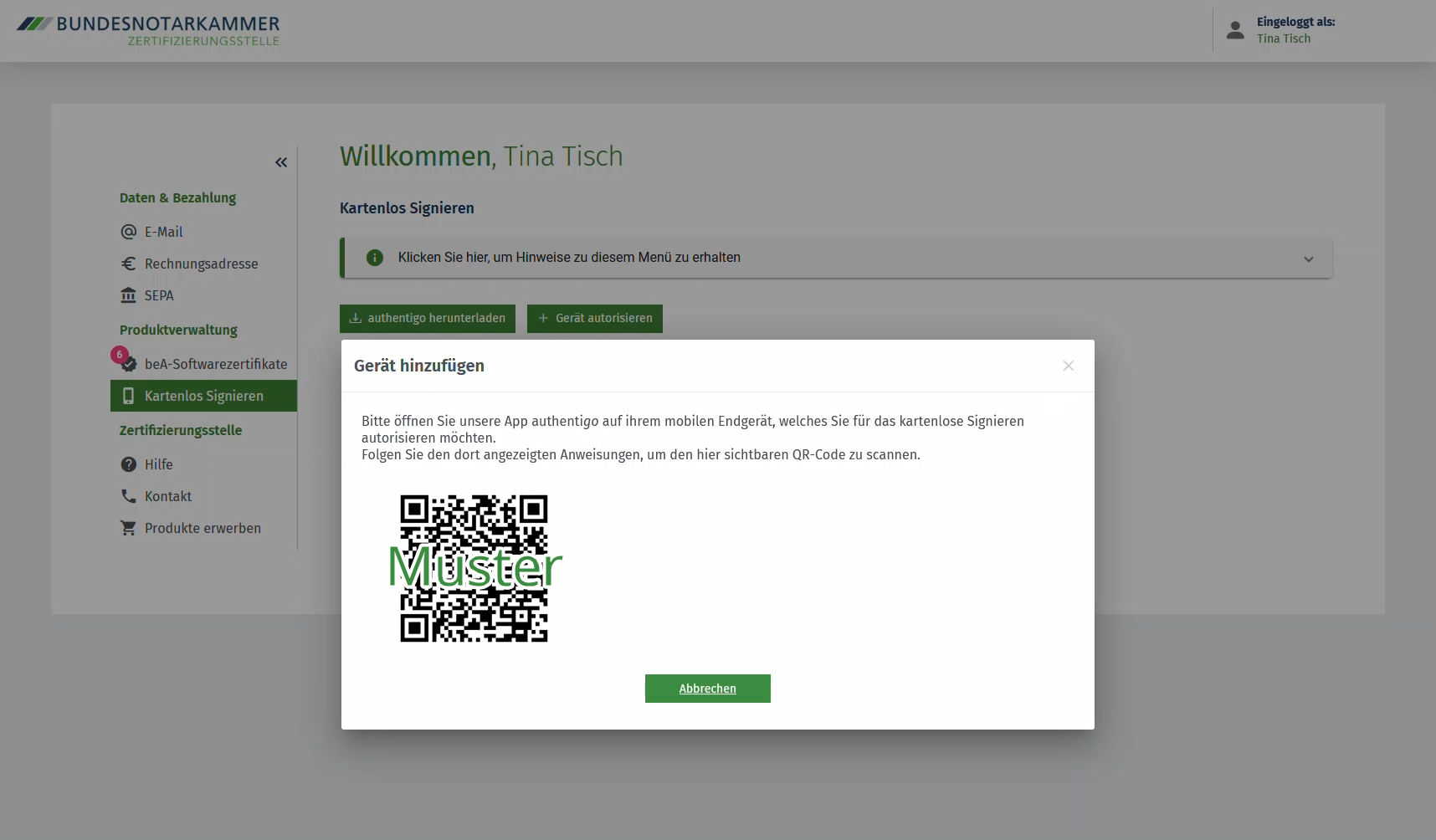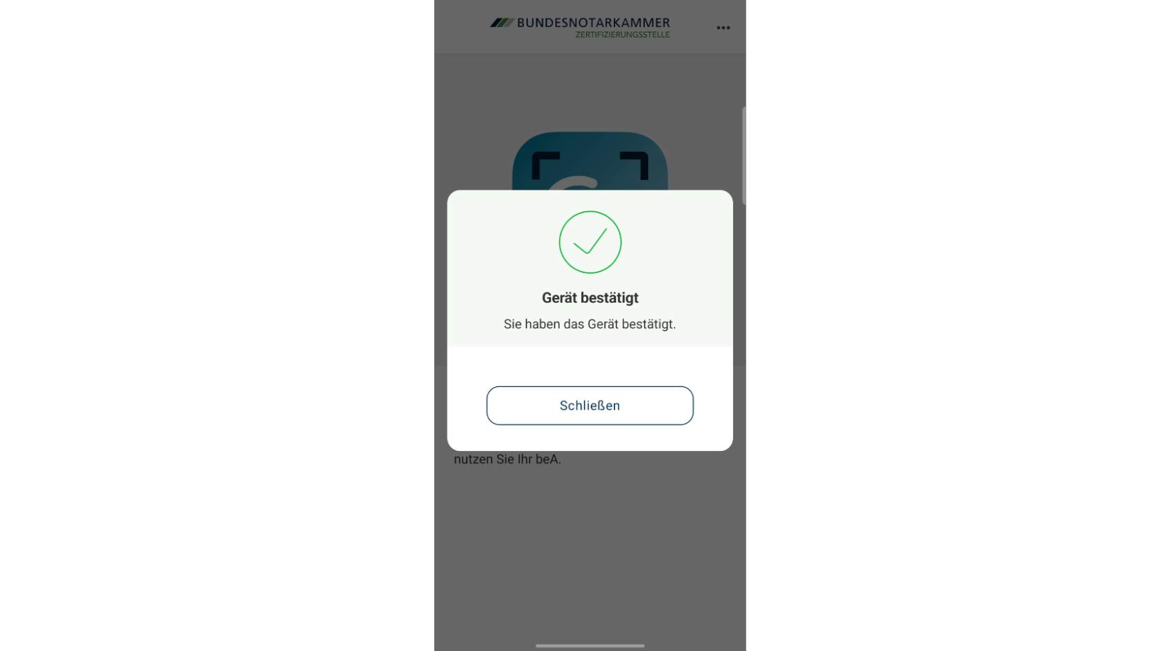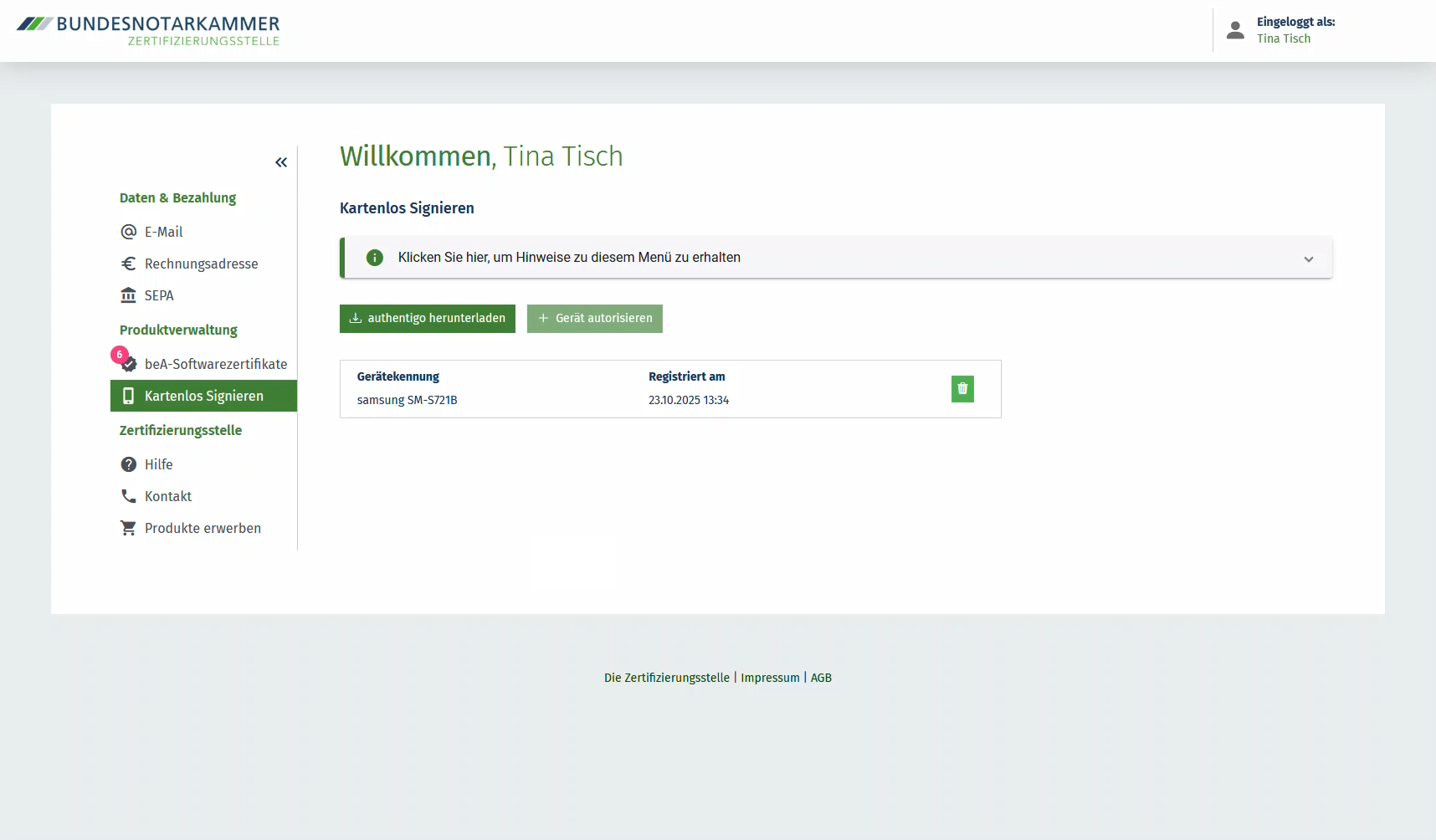 Bitte prüfen Sie nach erfolgter Registrierung Ihres mobilen Endgerätes im Kundenportal, dass ihr Endgerät dort als autorisiertes Enderät für das kartenlose Signieren hinterlegt ist.