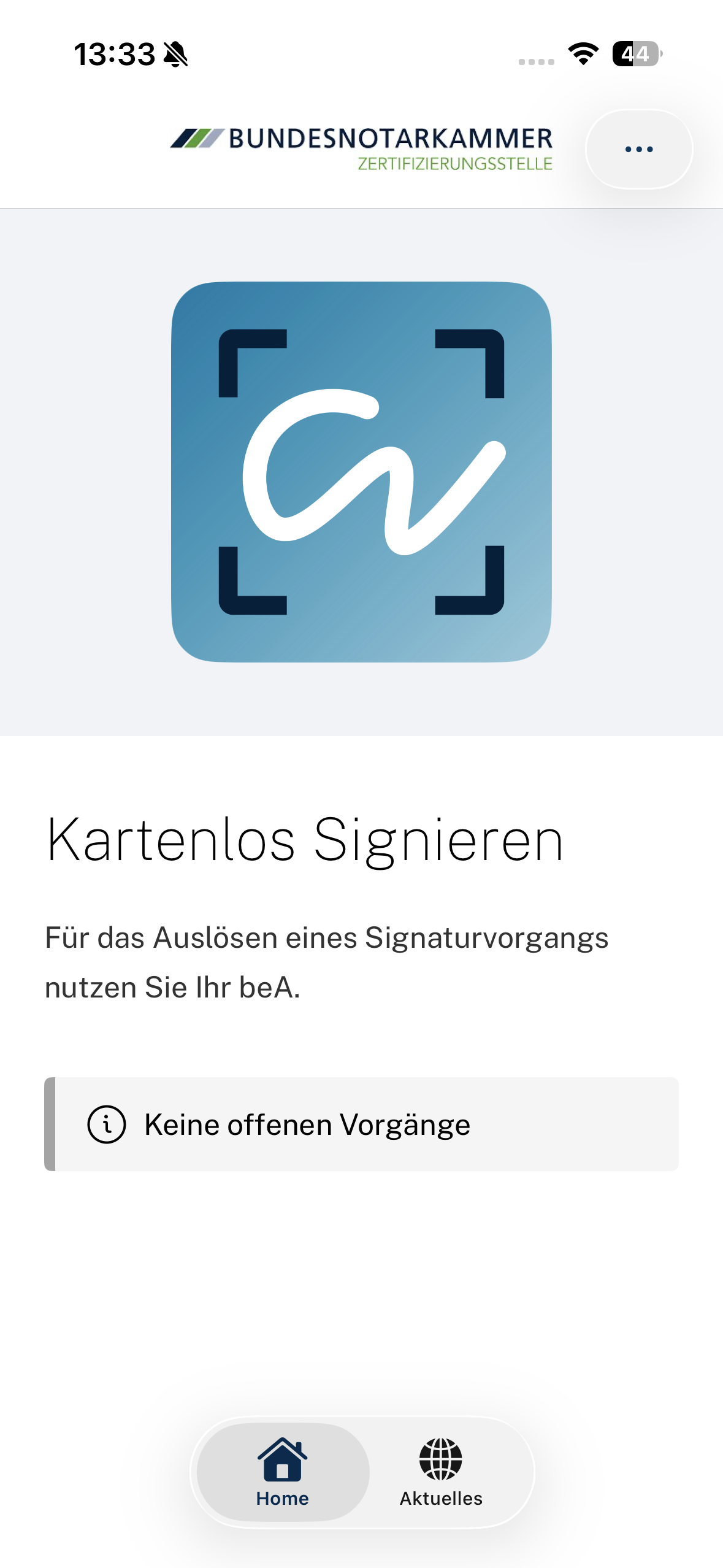 Hier können Sie offene Signaturfreigabeanfragen sehen oder gelangen über die drei Punkte in der oberen rechte Ecke in das Menü der App. iOS-Nutzer haben die Möglichkeit, über die Navigation auf “Aktuelles”, aktuelle Informationen der Bundesnotarkammer einsehen zu können.