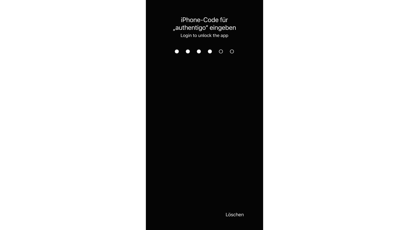 Die App muss zunächst entsperrt werden. Dies erfolgt mit dem gleichen Code wie die allgemeine Entsperrung Ihres mobilen Endgeräts durch PIN- bzw. Mustereingabe oder mittels biometrischen Fingerabdruck oder Gesichtserkennung, entsprechend der für die Sicherheit Ihres mobilen Endgerätes vorgenommenen Einstellungen.