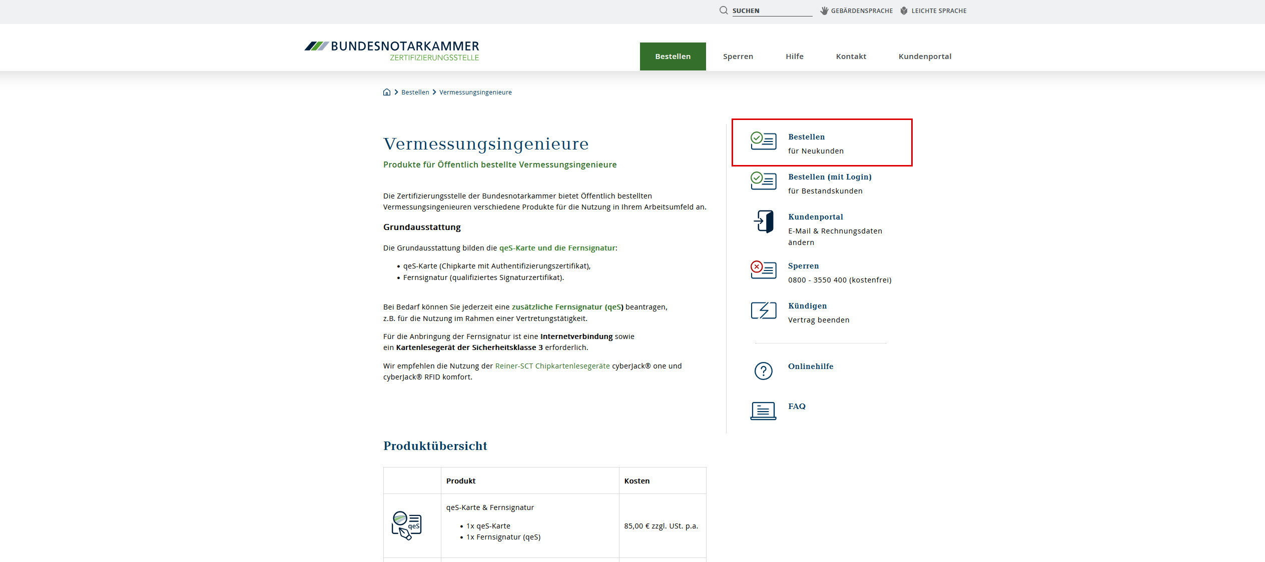 Ein direkter Einstieg ist zudem über diesen Link möglich: https://zertifizierungsstelle.bnotk.de/bestellen/vermessungsingenieure.